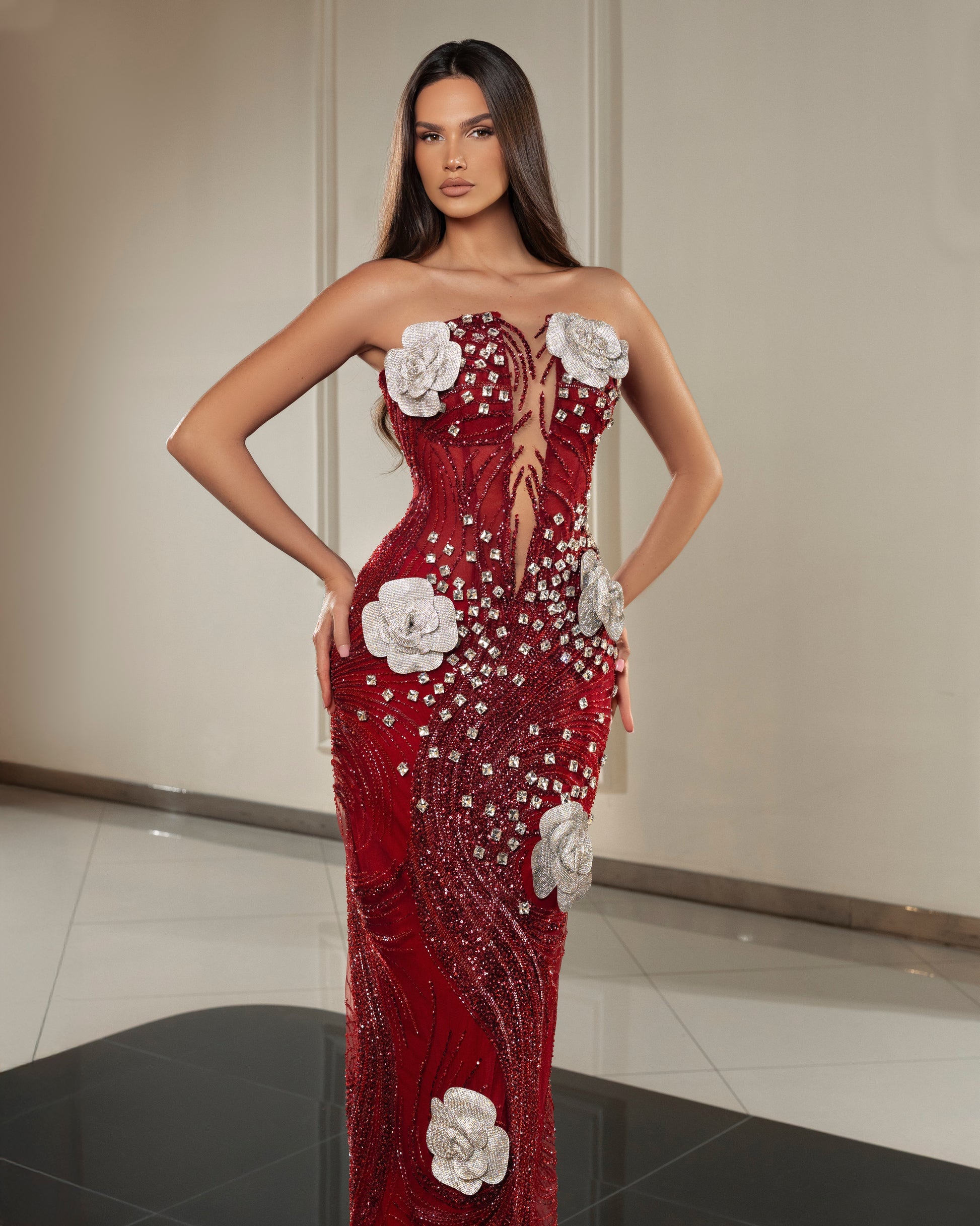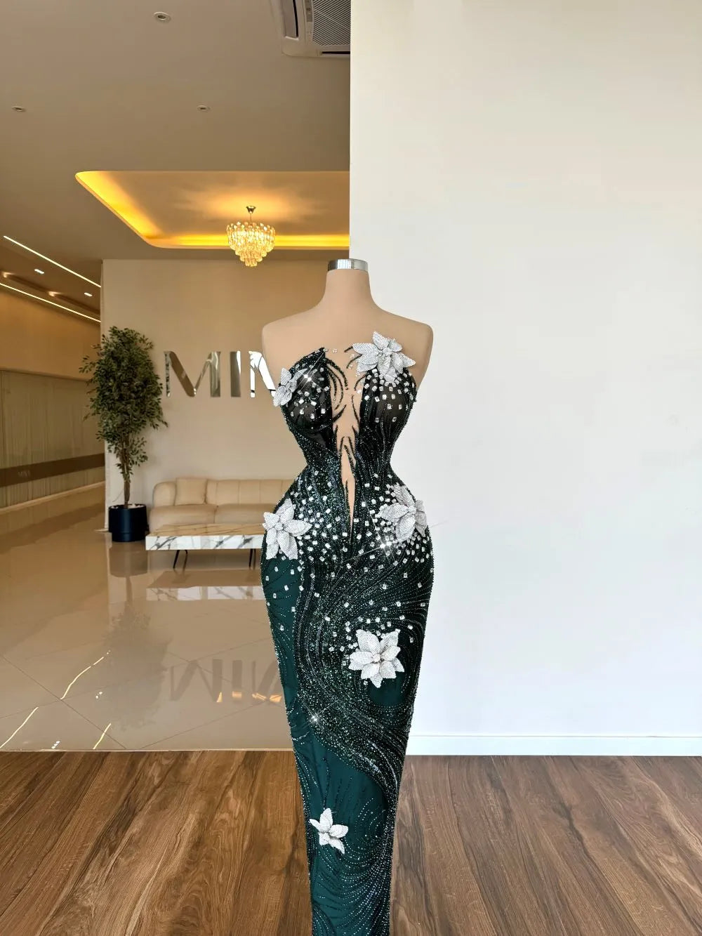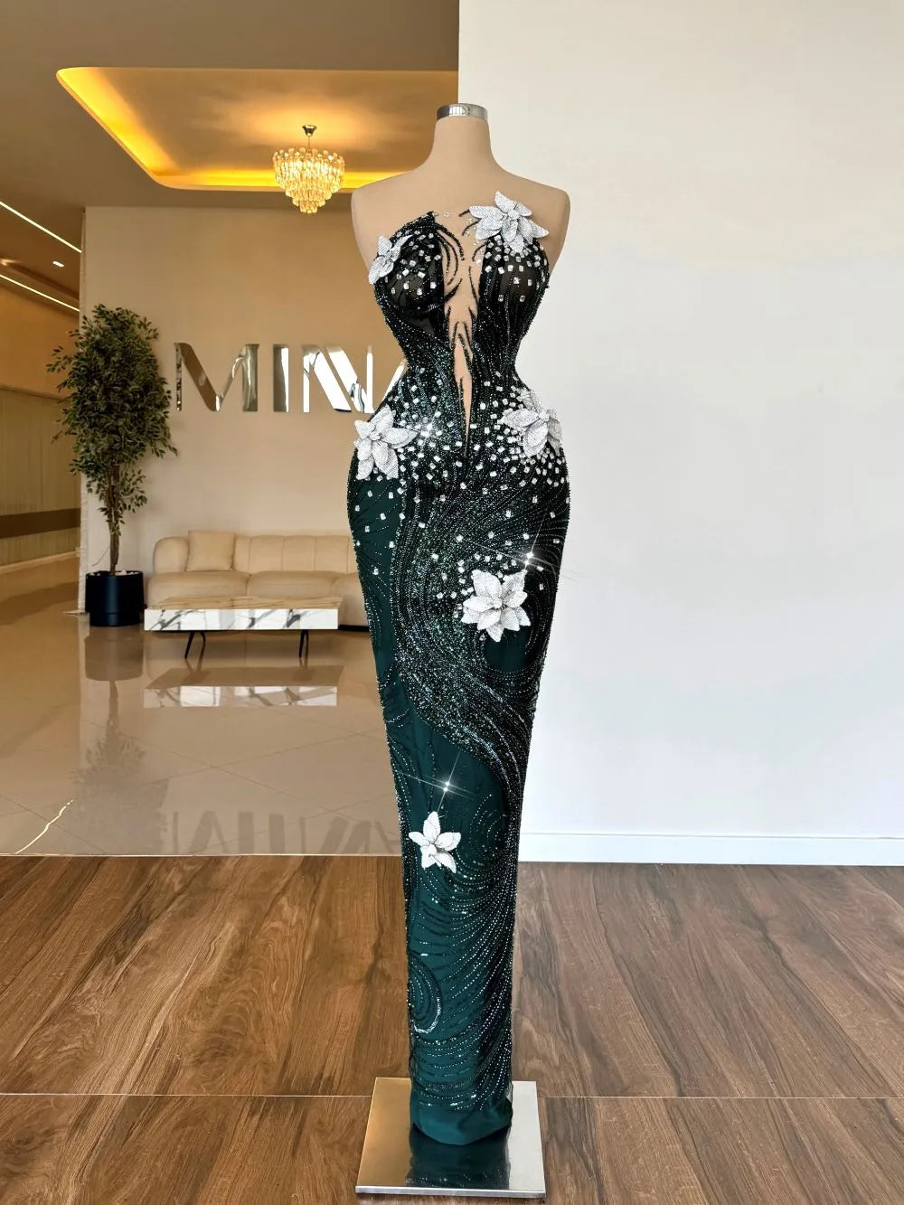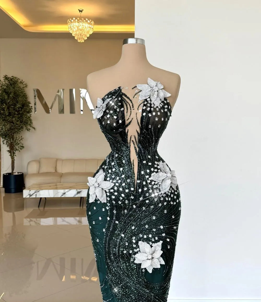 This dress is a show-stopping piece with a deep emerald green hue, adorned with intricate silver beadwork that creates a swirling, wave-like pattern. White floral appliqués embellish the bodice and skirt, adding a touch of elegance and contrast to the dark base. The plunging neckline and fitted silhouette enhance the dramatic and glamorous feel, making this gown perfect for a striking red-carpet entrance.
