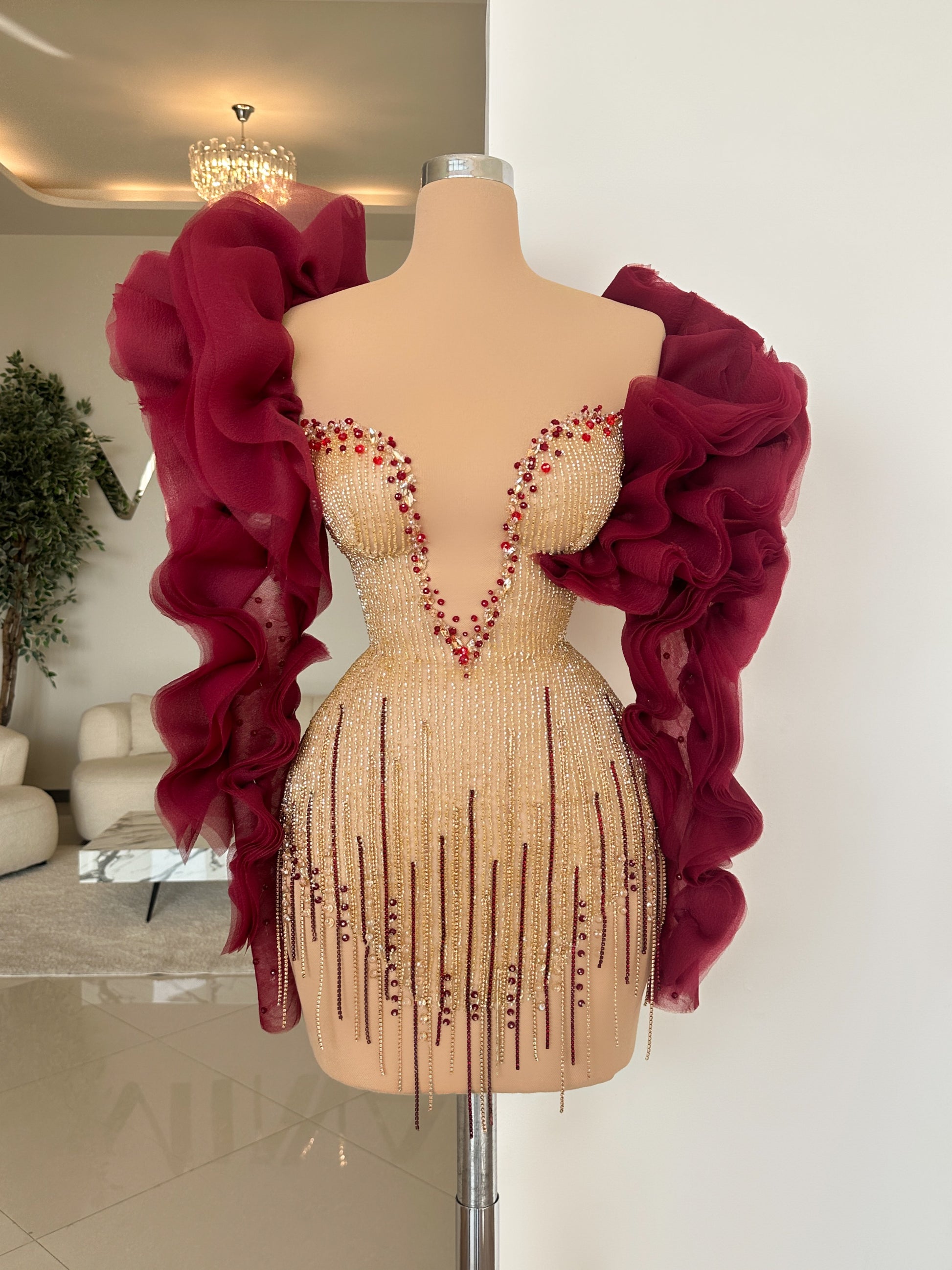 A beautiful combination of two glamorous colors, that perfectly complement each other and fulfill each ones shades. Our "Cera" short cocktail and party dress has a two dramatic ruffled long sleeves, in a maroon shade. It's sweetheart neckline is handmade with maroon stones for a fuller look to the overall design. The end of the dress is aswell handmade with fringes and stones, so that the design is fully completed, and will make the entrance you need!