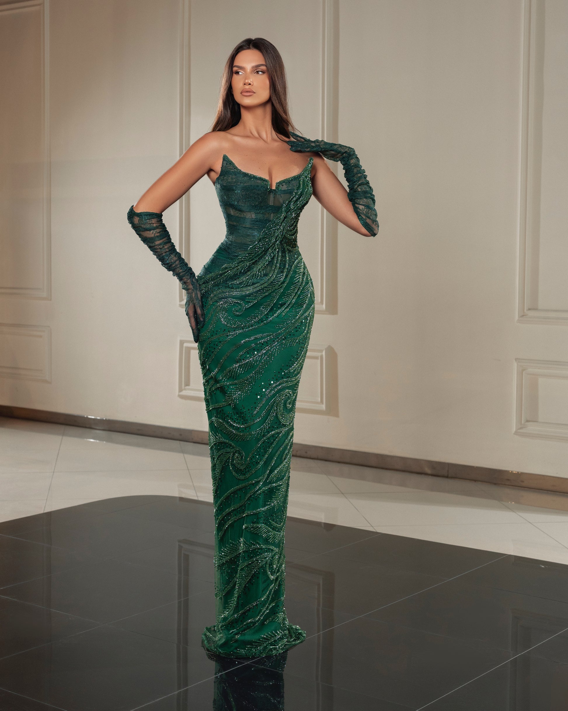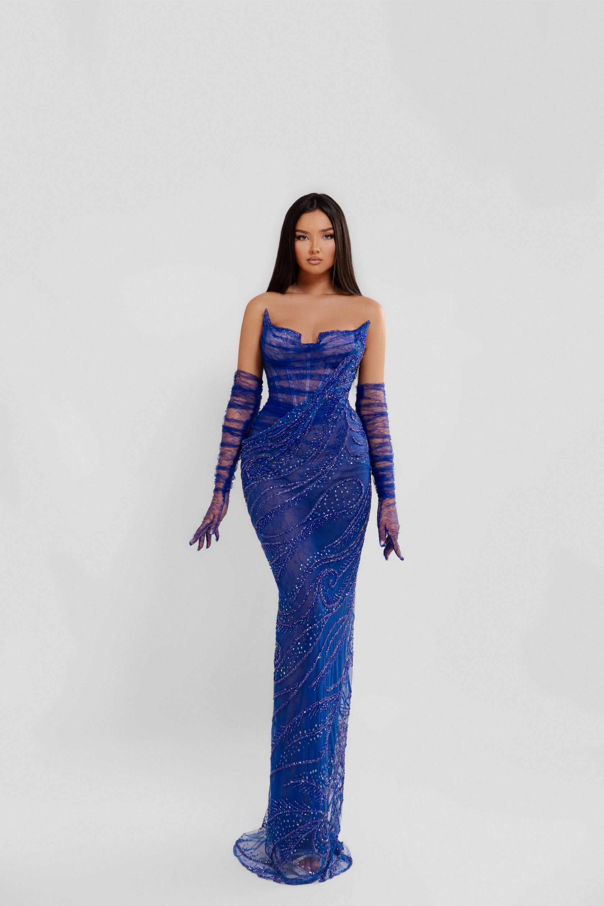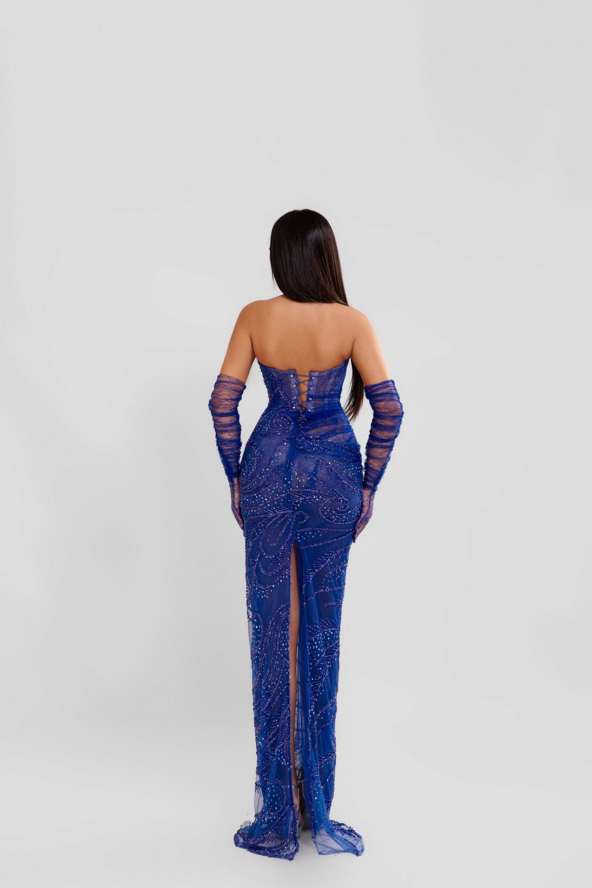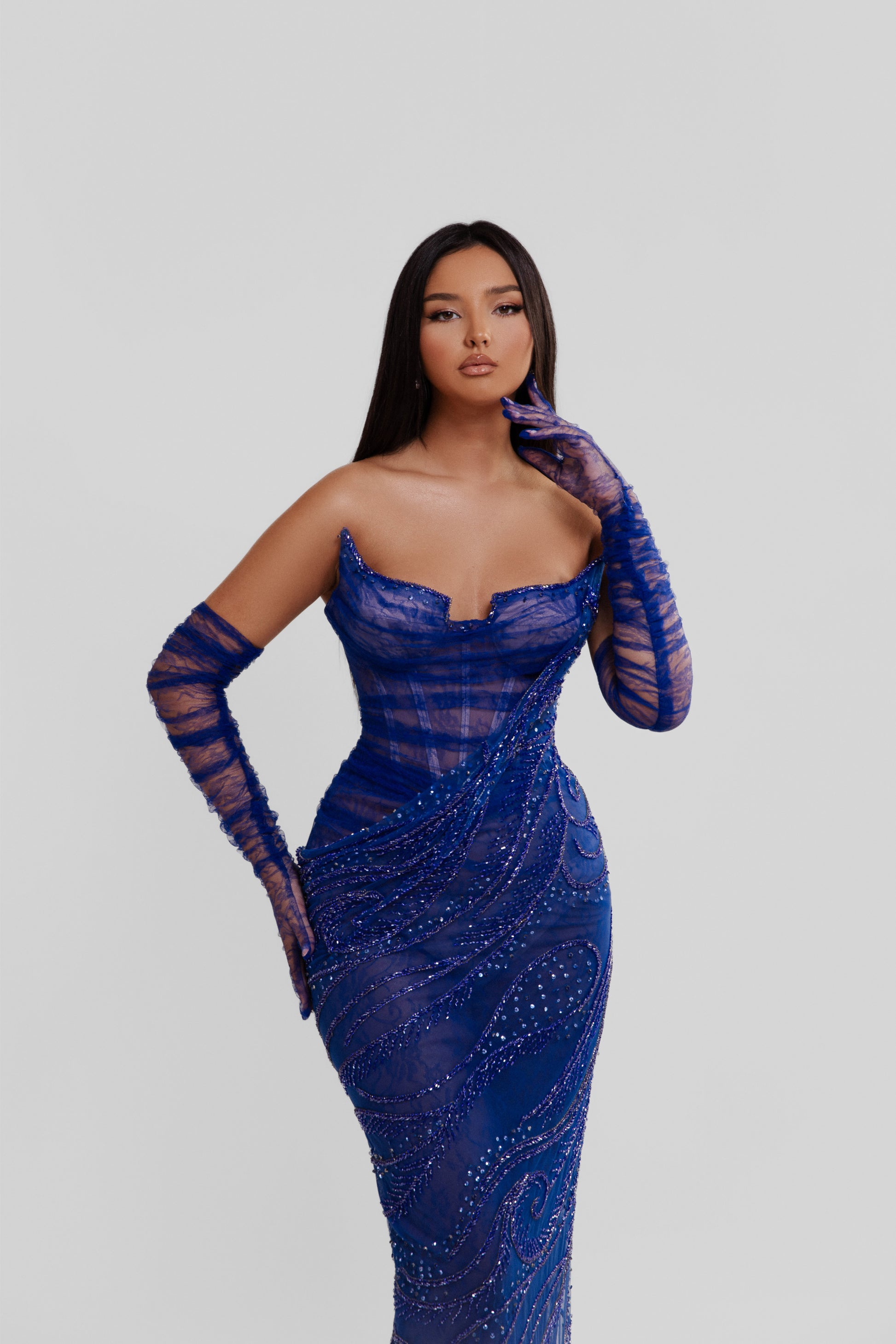 Our Eileen dress features a strapless, sweetheart neckline and is made of a semi-sheer fabric overlay that's heavily adorned with swirling patterns of blue sequins and beads, creating a sparkling and textured effect. The gown is accompanied by matching long, sheer gloves that are also embellished with the same sequined and beaded pattern.