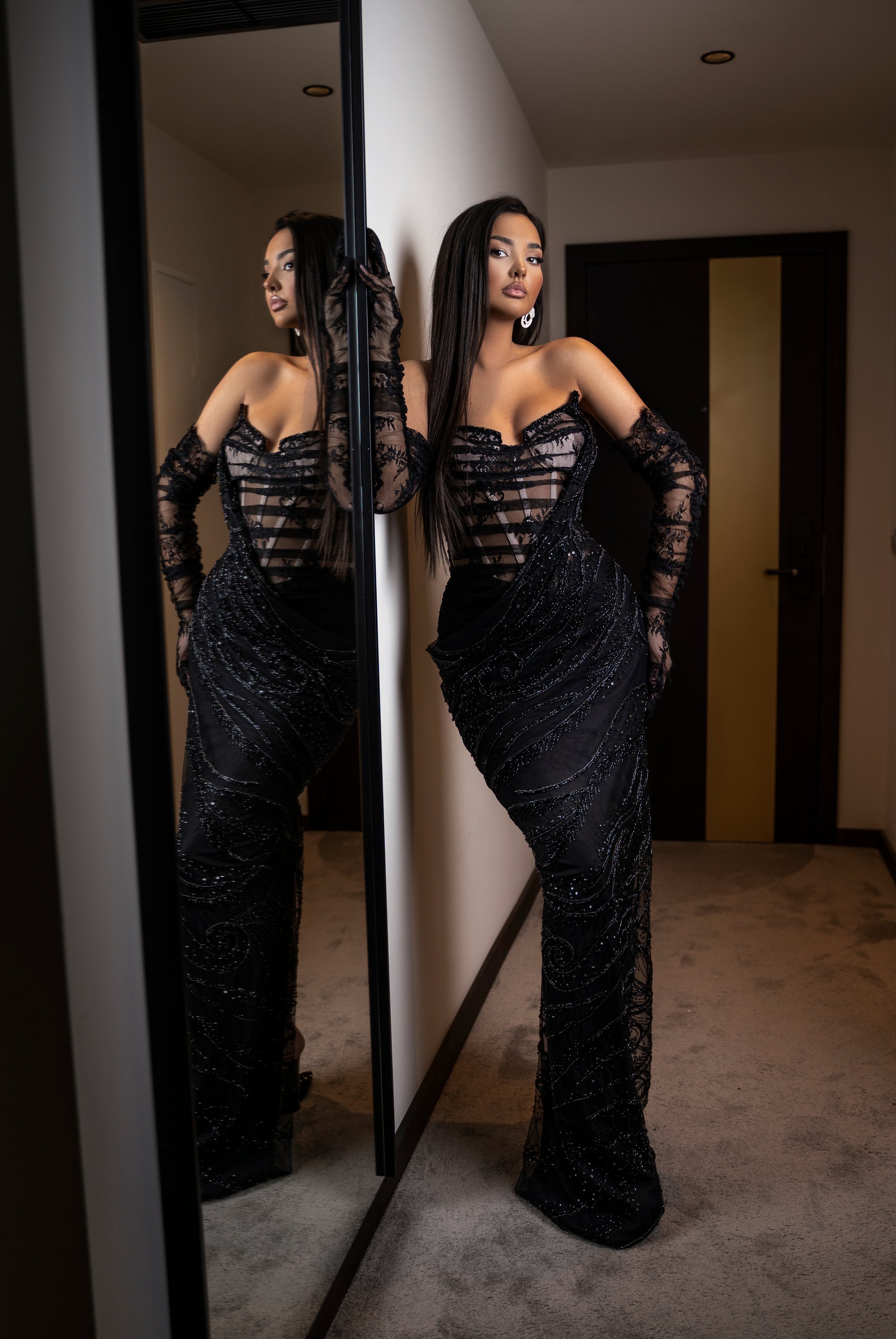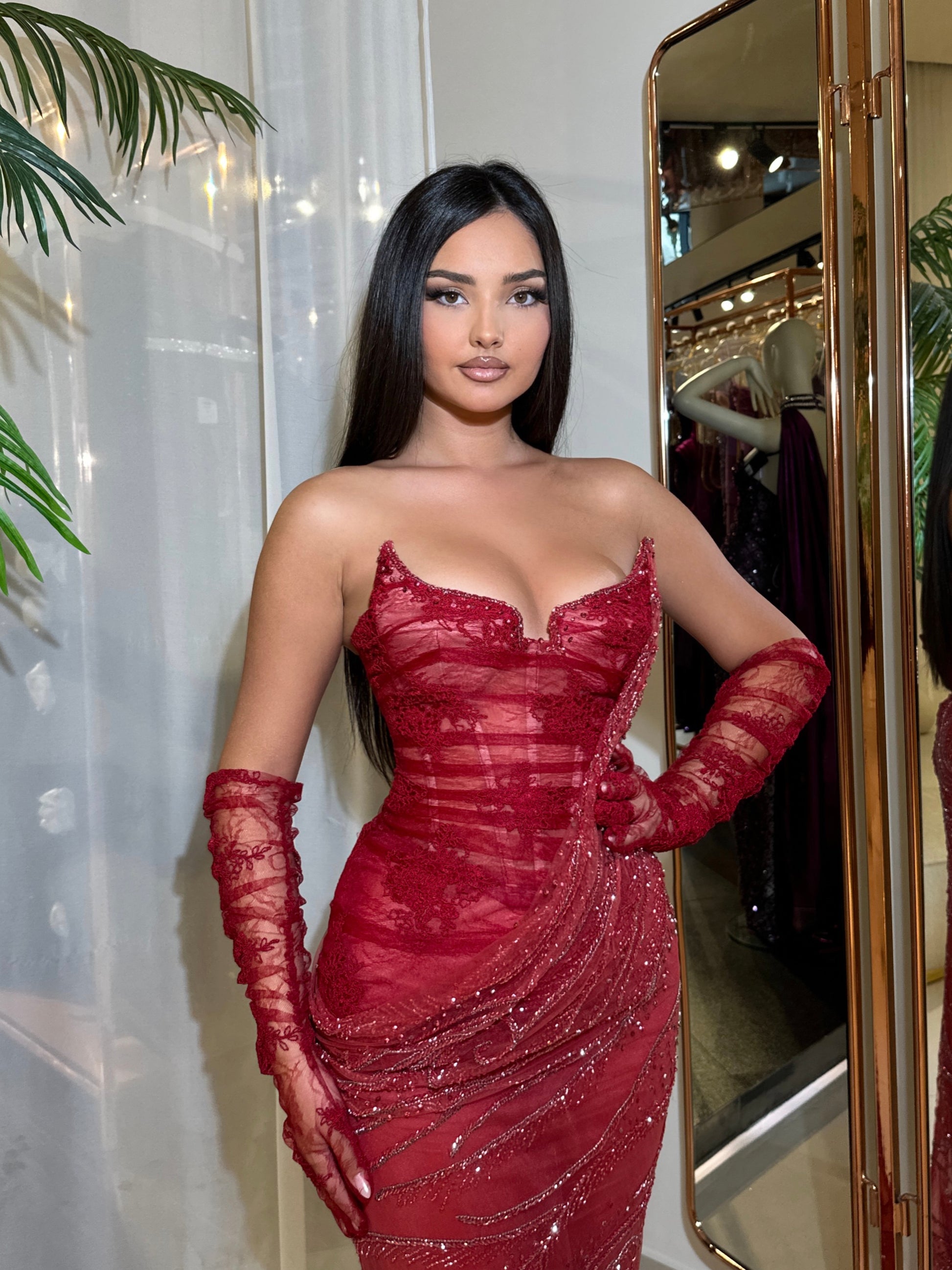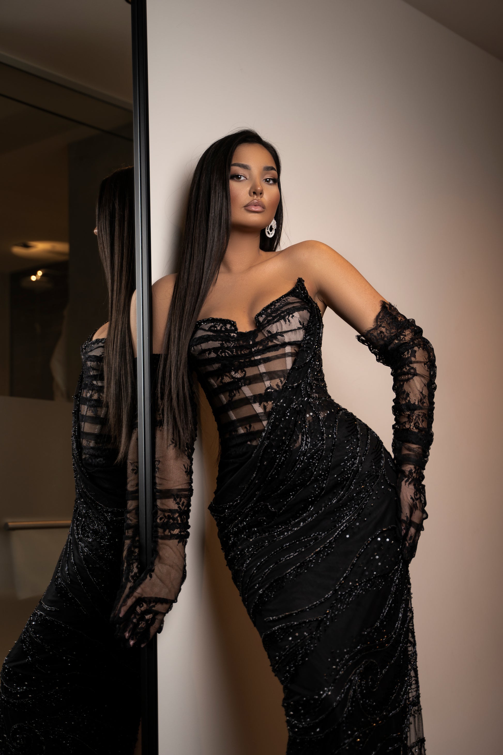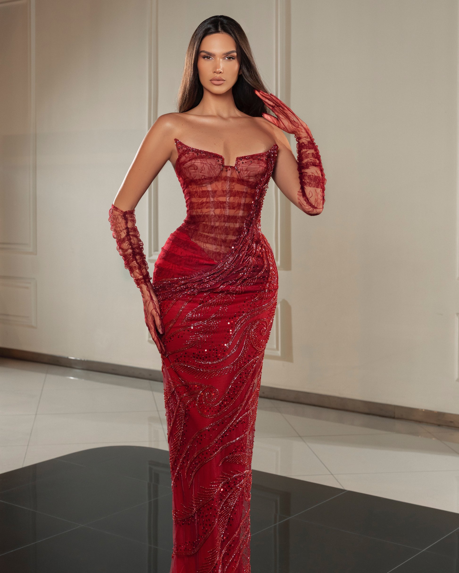 Our Eileen dress features a strapless, sweetheart neckline and is made of a semi-sheer fabric overlay that's heavily adorned with swirling patterns of blue sequins and beads, creating a sparkling and textured effect. The gown is accompanied by matching long, sheer gloves that are also embellished with the same sequined and beaded pattern.