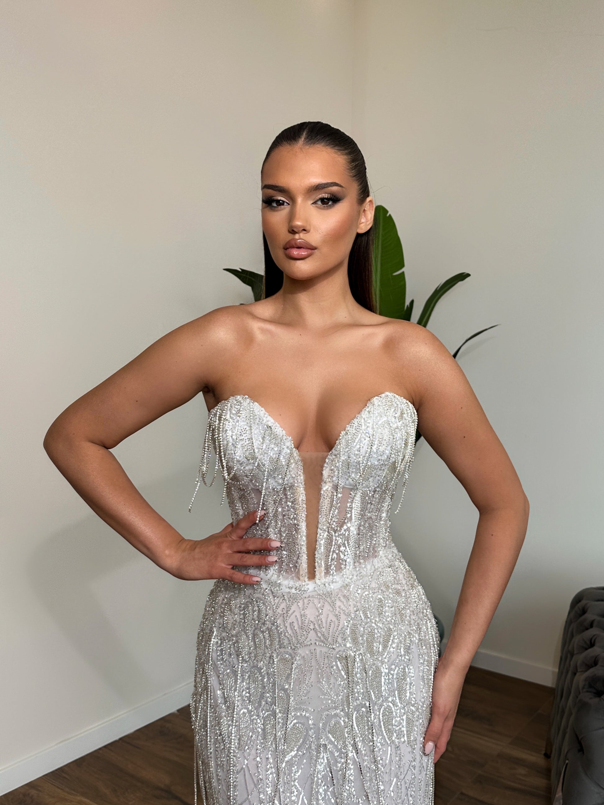 This dress is a stunning creation that exudes opulence and sophistication. It features a beautifully structured bodice with a sweetheart neckline, meticulously adorned with sparkling embellishments that cascade into a flowing, sheer overlay. The overlay is crafted with delicate beading and sequins in an intricate pattern, creating an ethereal shimmer that enhances the gown's luxurious appeal.