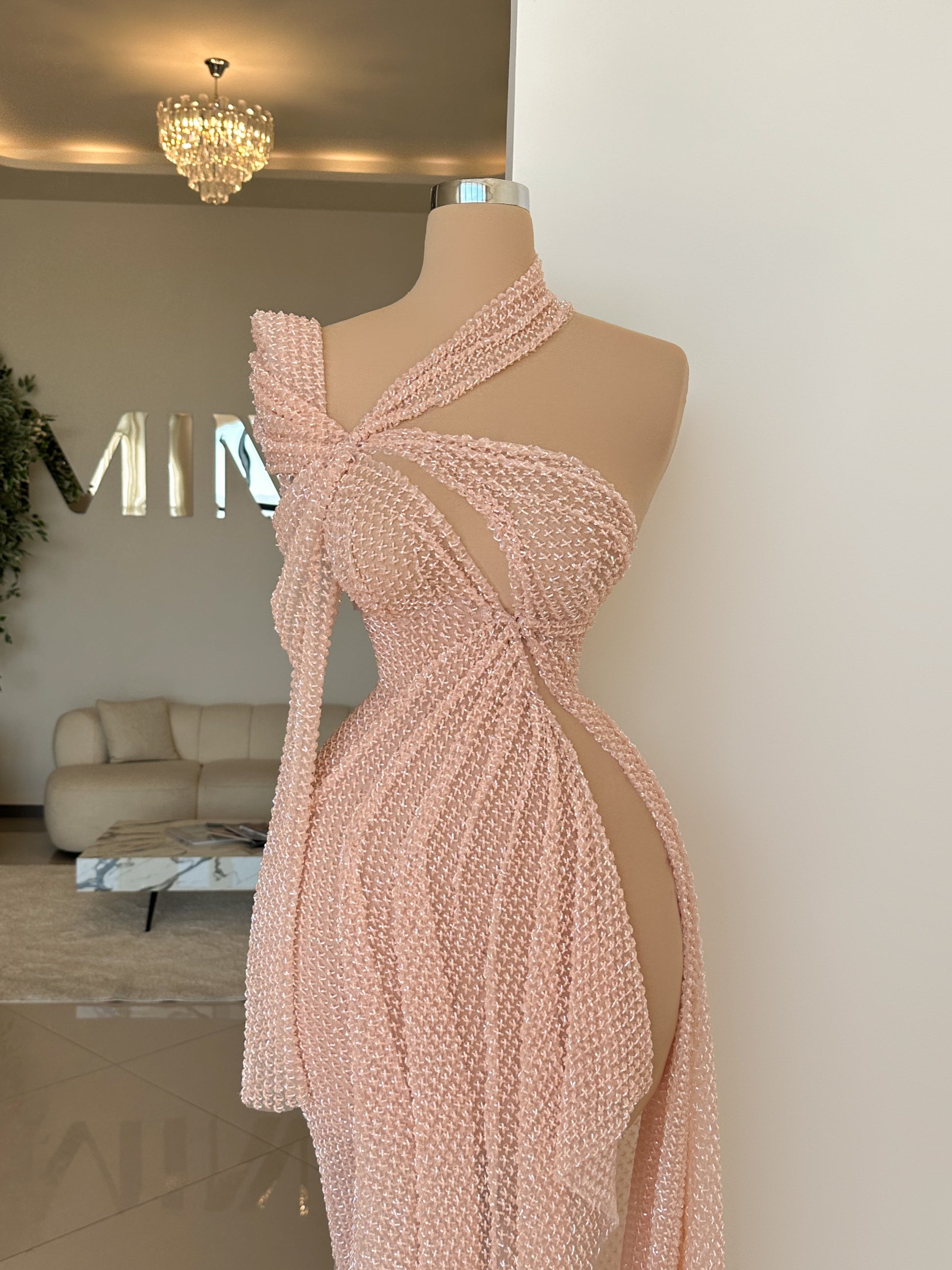 This long dress is a luxurious creation with a wrap-around design that flatters the form. The fabric is embellished with numerous tiny sparkles that give the dress a shimmering, textured appearance. It features an asymmetrical neckline with a single shoulder strap that splits into two delicate strands at the back, adding an interesting visual detail. The "Enza" dress hugs the body, highlighting the waist with a gathered side that cascades into a flowy skirt with a generous train, enhancing the fluidity and elegance of the silhouette. This dress merges classic grace with a touch of modernity.