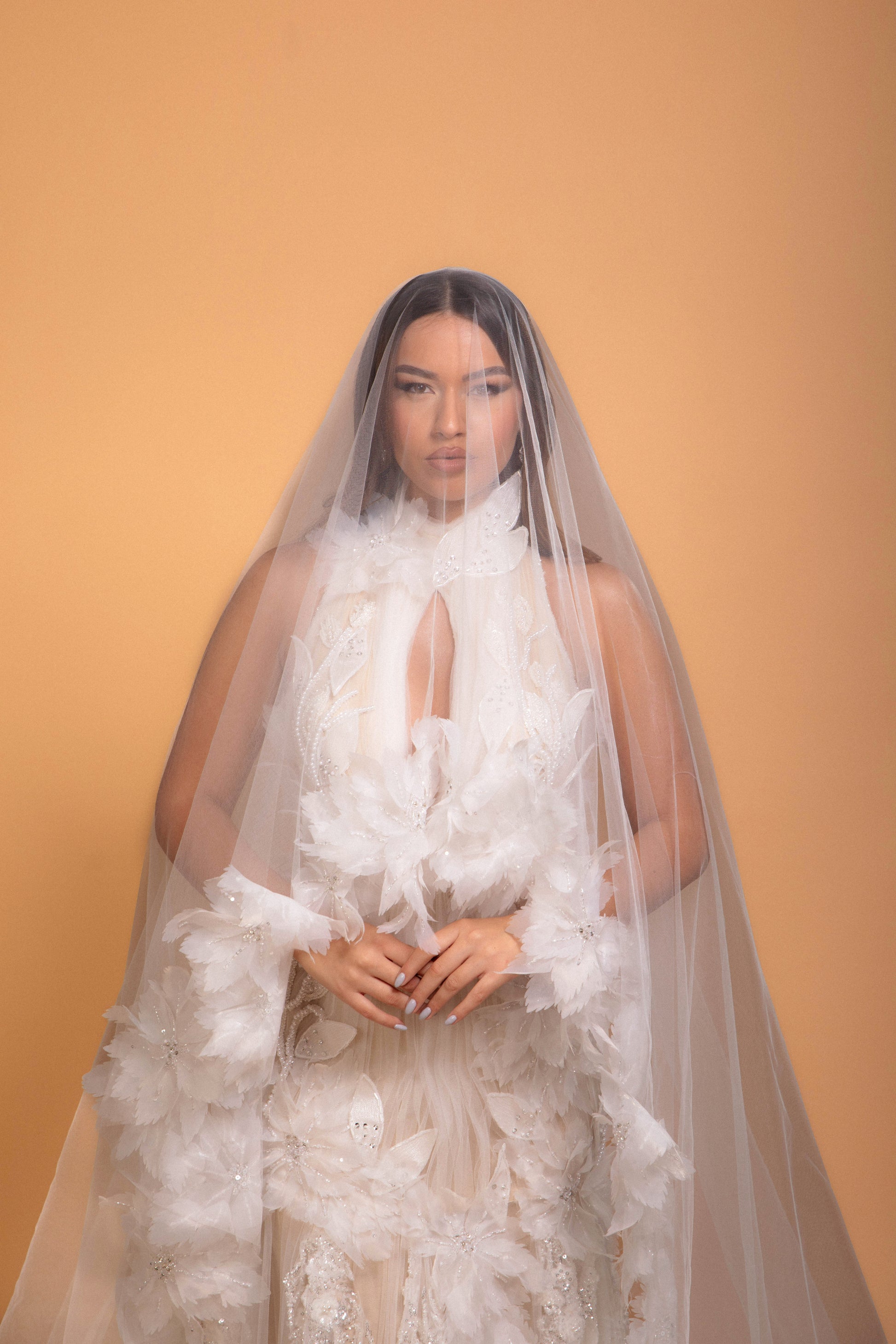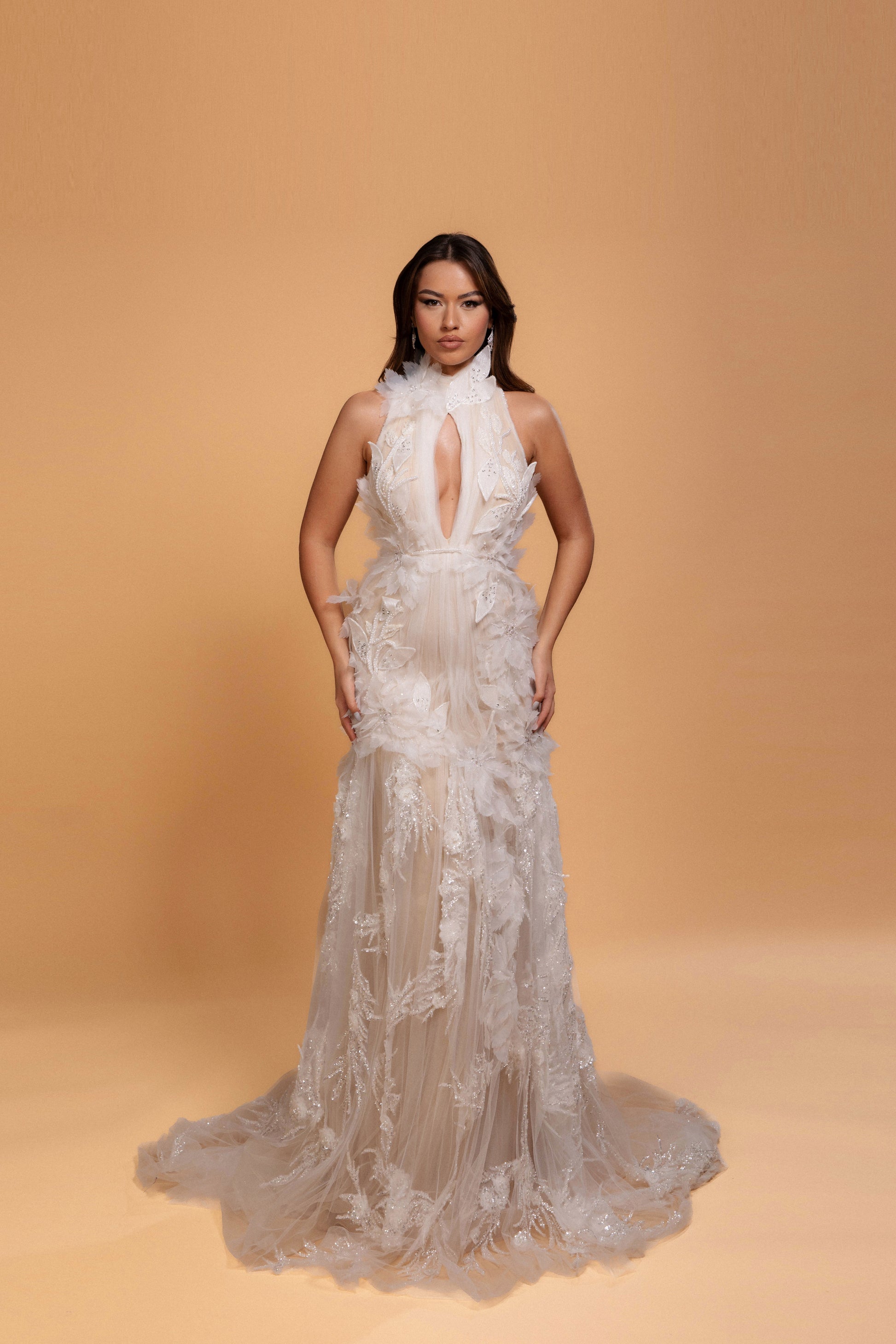This dress is a masterclass in handcrafted sophistication, designed for the most glamorous of evening events. Its high neck and sleeveless cut invoke a modern yet timeless elegance, while the sheer bodice, adorned with delicate appliques, offers a daring and sensual edge. Flowing effortlessly to the ground, the skirt blooms with layered applique detailing, adding a dimension of texture and romanticism. This piece is a true reflection of couture craftsmanship, perfect for anyone seeking a statement gown that marries daring design with classic luxury.