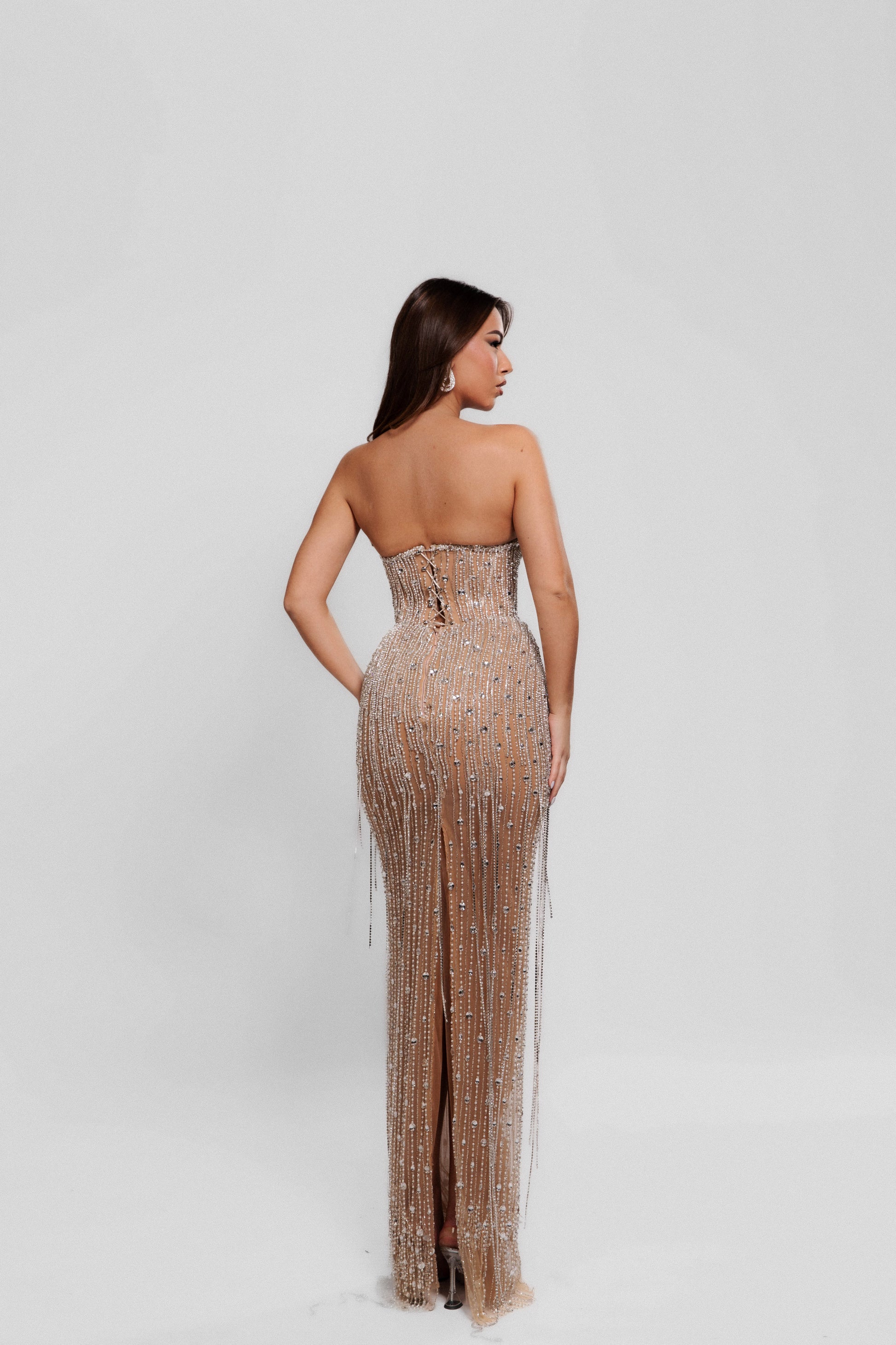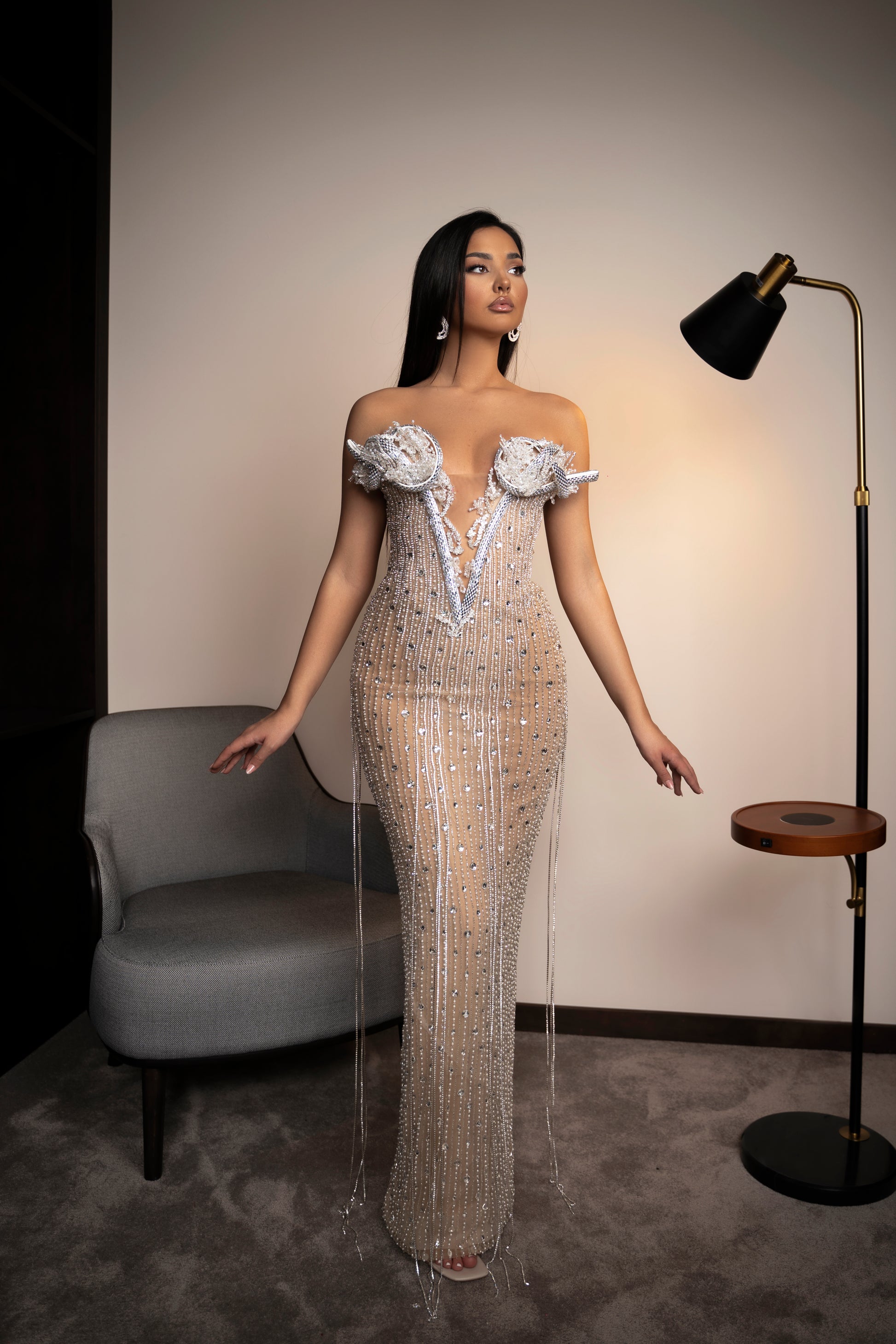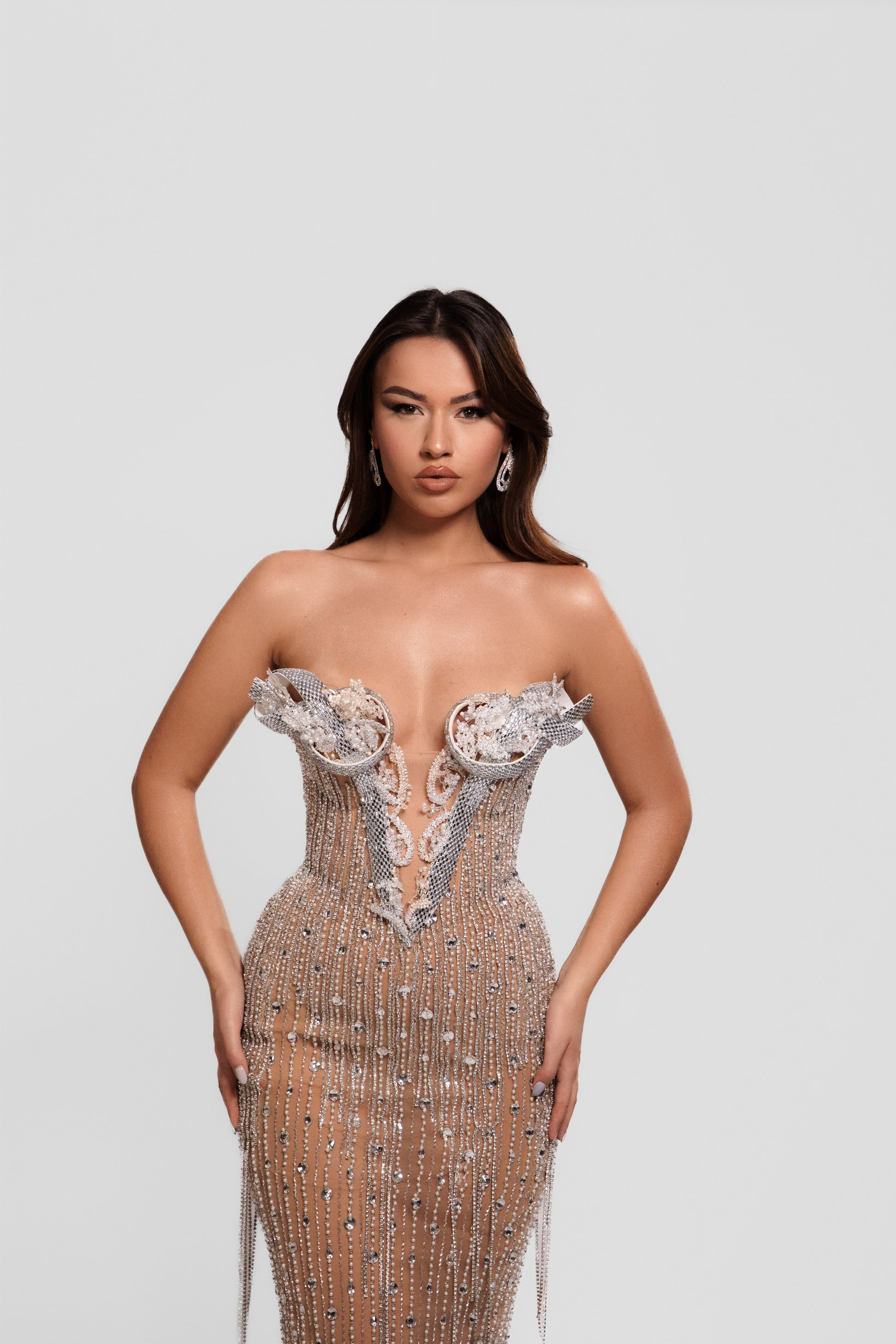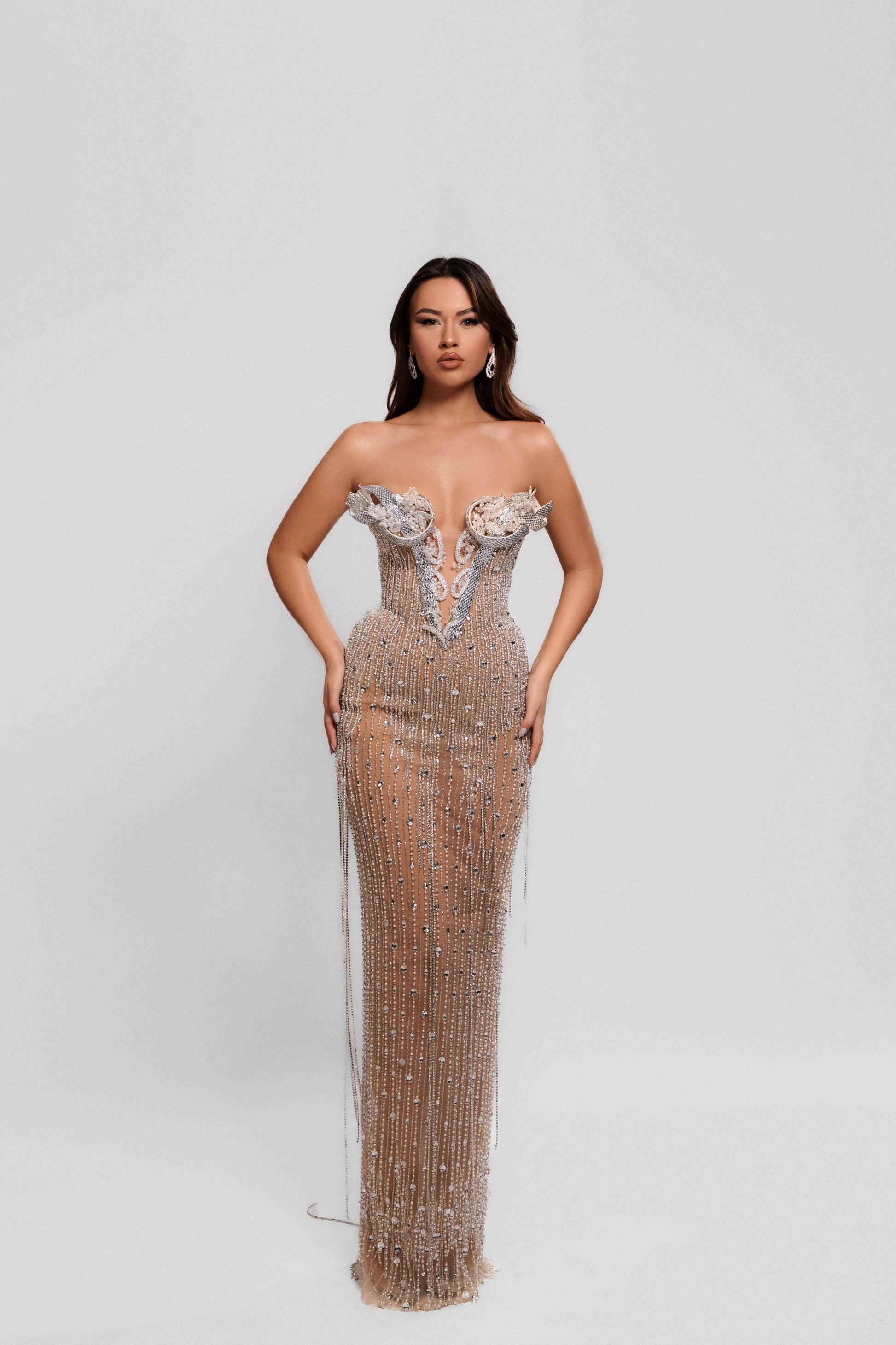 The dress in the image is a sophisticated, form-fitting gown that exudes luxury and high fashion. It is designed with a strapless silhouette that showcases the shoulders and collarbones. The bodice is structured with a sweetheart neckline, featuring opulent embellishments that include intricate beading and embroidery. These adornments create a baroque-inspired pattern, giving the dress a sense of grandeur and opulence.