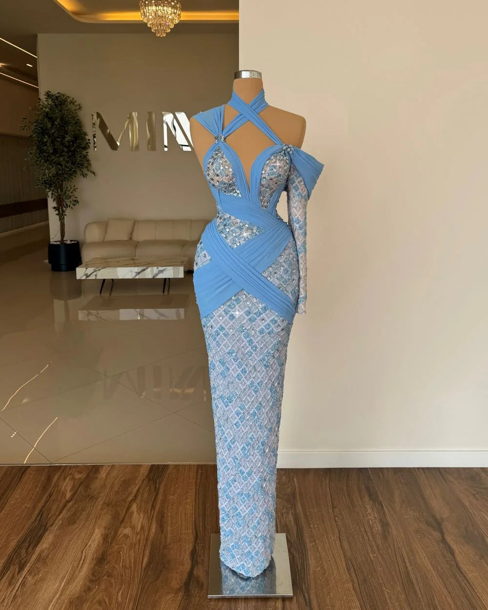 This long light blue dress with an elaborate, geometric pattern in silver and blue beading, gives a shimmering, textured effect. The gown features unique crisscross straps across the chest, creating an eye-catching design that frames the neckline and shoulders. One sleeve is long and fitted with intricate beadwork, while the other side is left bare, adding asymmetry and modernity to the look. The wrap-style fabric around the waist enhances the silhouette, adding a sense of structure and sophistication. This gown is perfect for someone looking to make a bold and elegant statement with a contemporary edge.