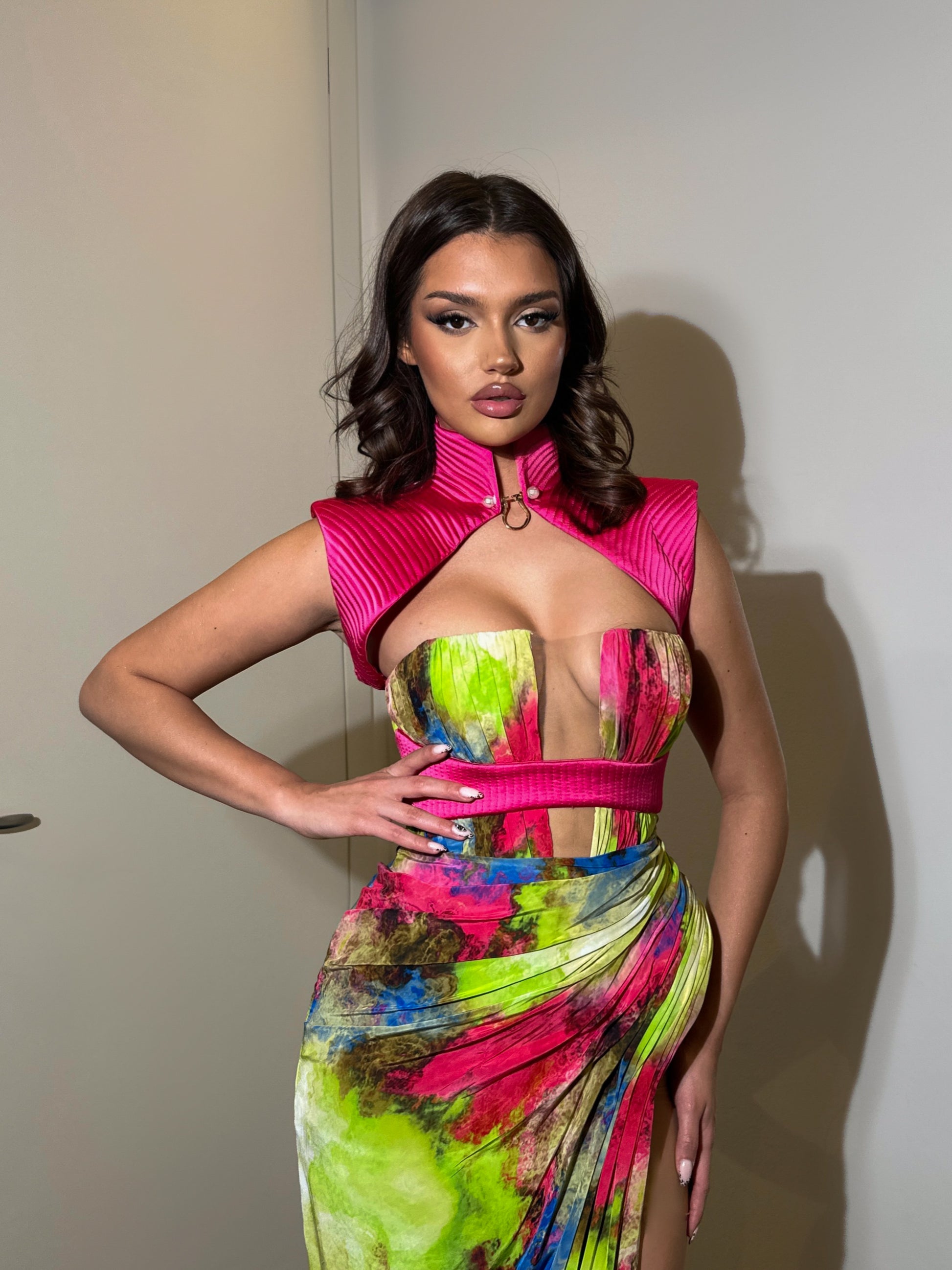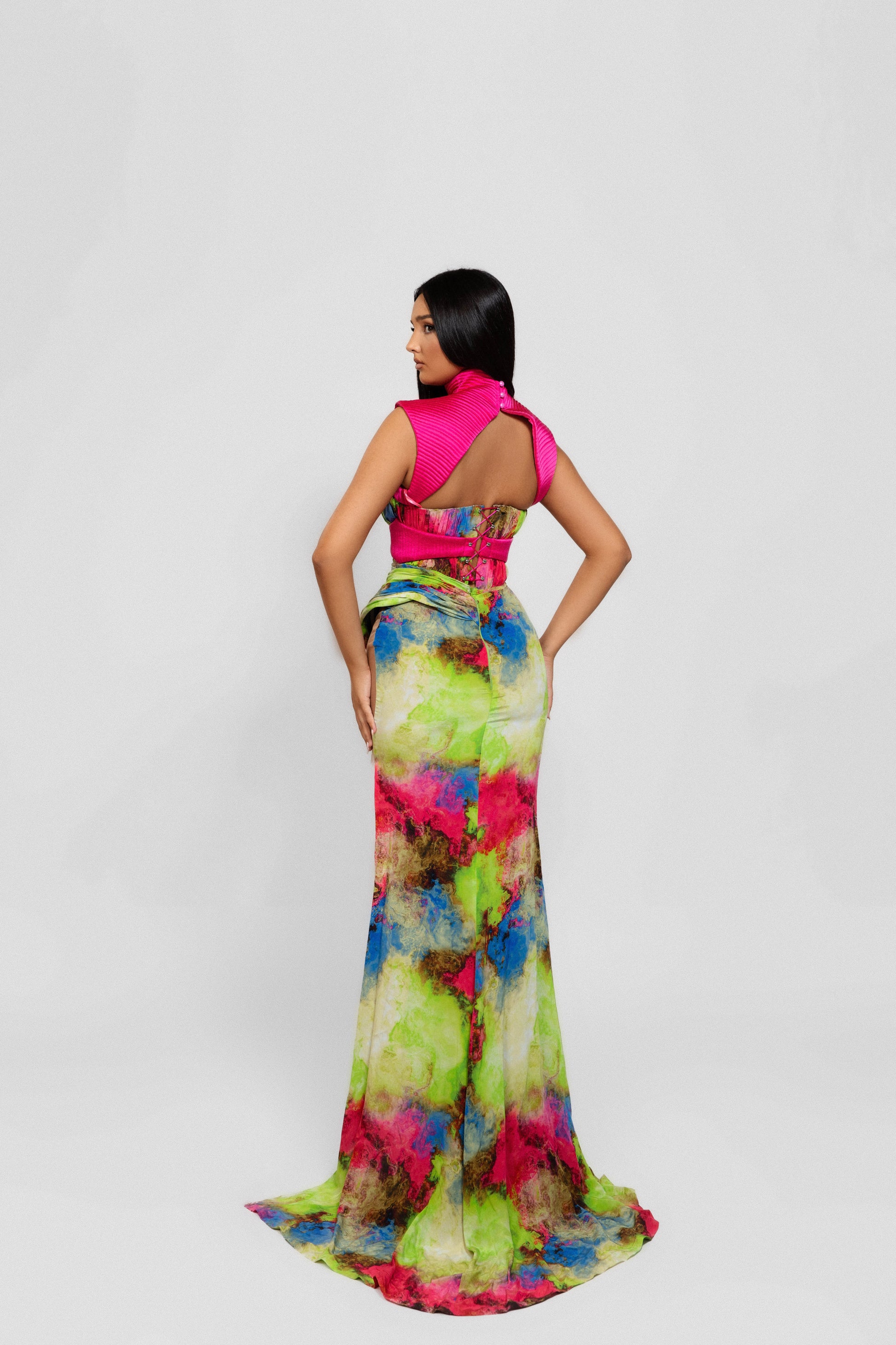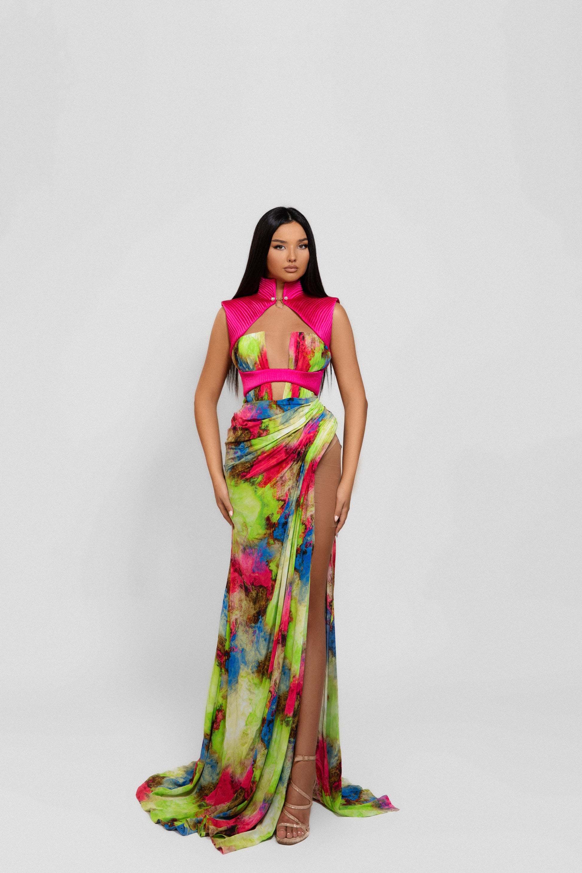 Harmony dress offers a bold aesthetic with a high neck and a sleeveless cut. The bodice is structured with a keyhole cut-out at the chest, while the waist is cinched to accentuate the figure. The skirt drapes gracefully, with a wrap-style detail that leads into a high slit, and it flows into a sweeping train. The dress combines a sleek fit with dynamic drapery, giving it a contemporary and sophisticated character.