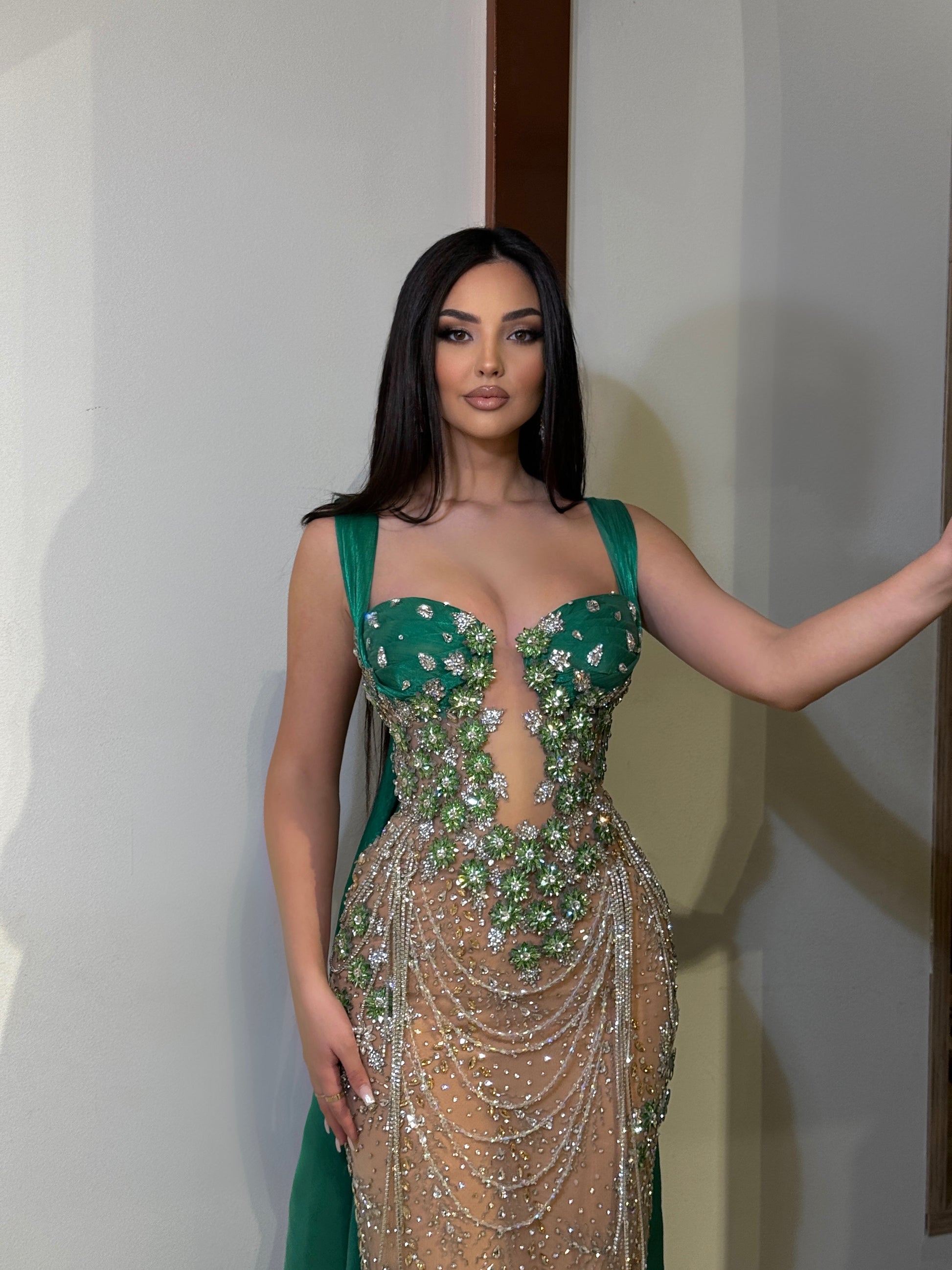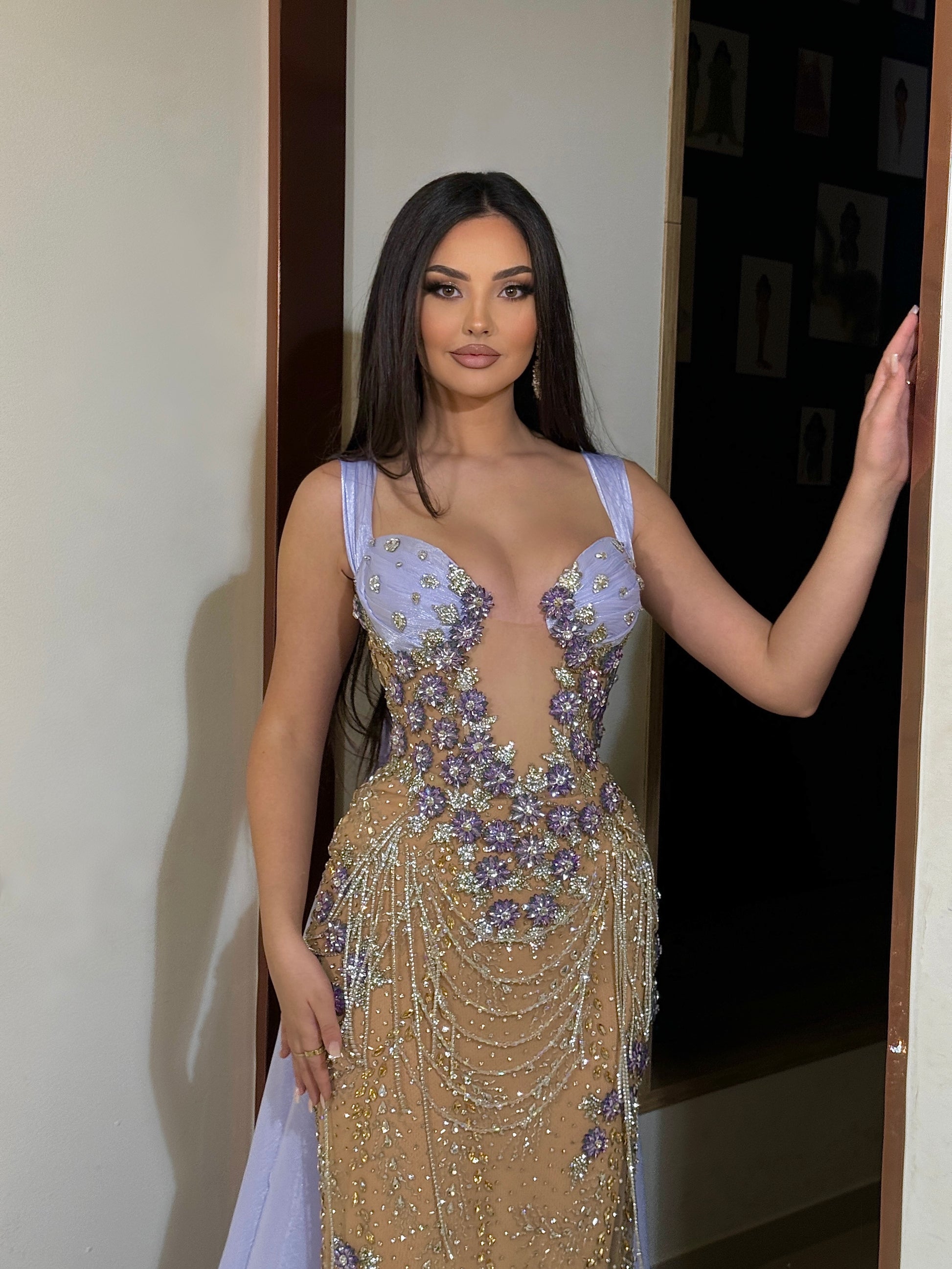 A breathtaking harmony of elegance and artistry, this couture masterpiece is adorned with intricate beadwork and shimmering embellishments, creating a striking visual symphony.