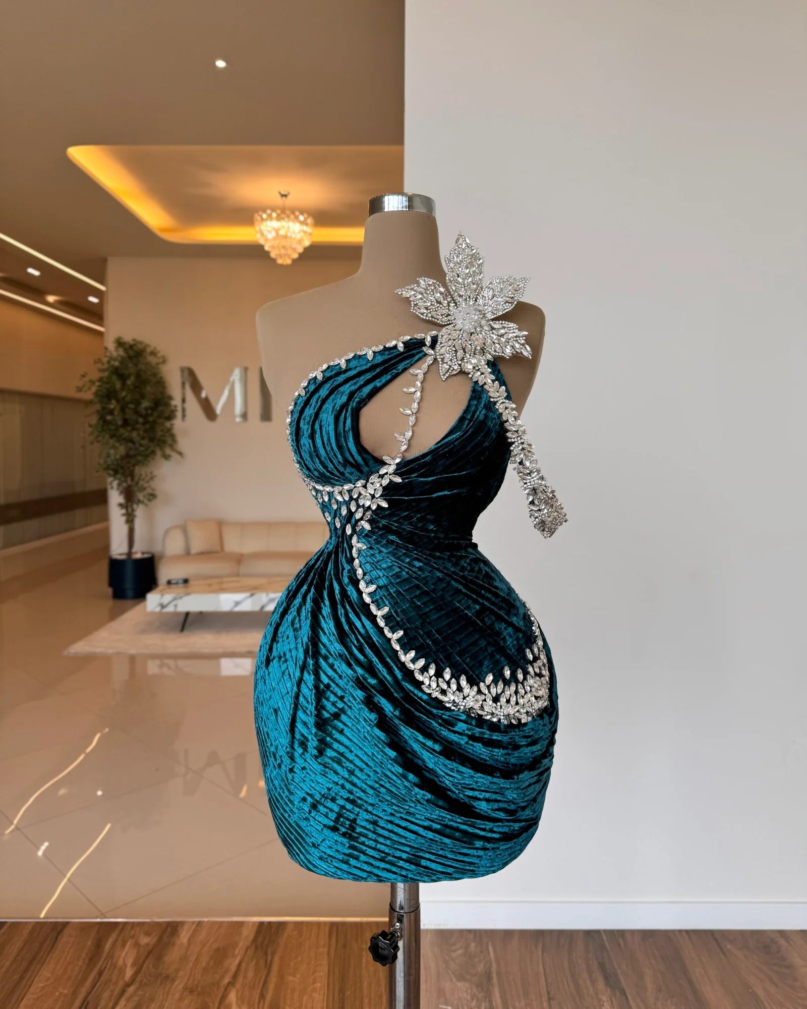 The dress has an asymmetrical one-shoulder design with a fitted structure that highlights the curves. A cascading arrangement of silver crystal embellishments follows the curves of the dress, creating a swirling motion. A standout feature is the large floral embellishment at the shoulder, adding drama and elegance. The dress incorporates a cutout element that provides a modern edge, balancing the classic velvet material with contemporary design.