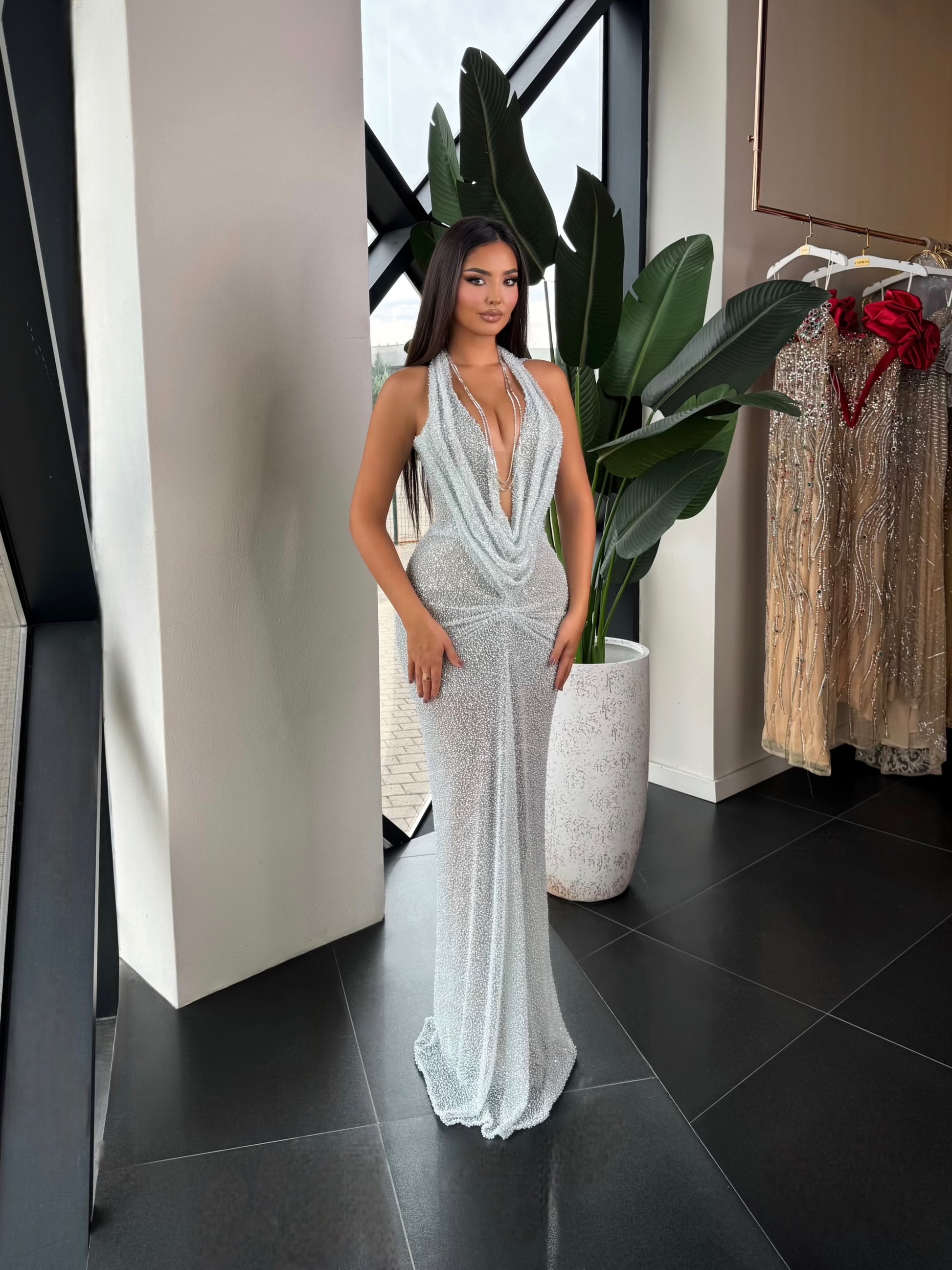 This floor-length gown is adorned with shimmering silver sequins that catch the light from every angle, ensuring you’ll shine at any formal event or red carpet occasion.