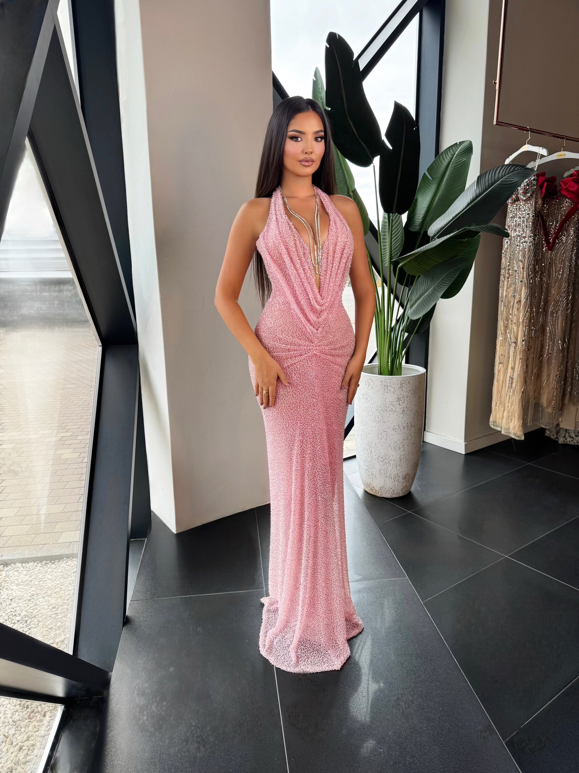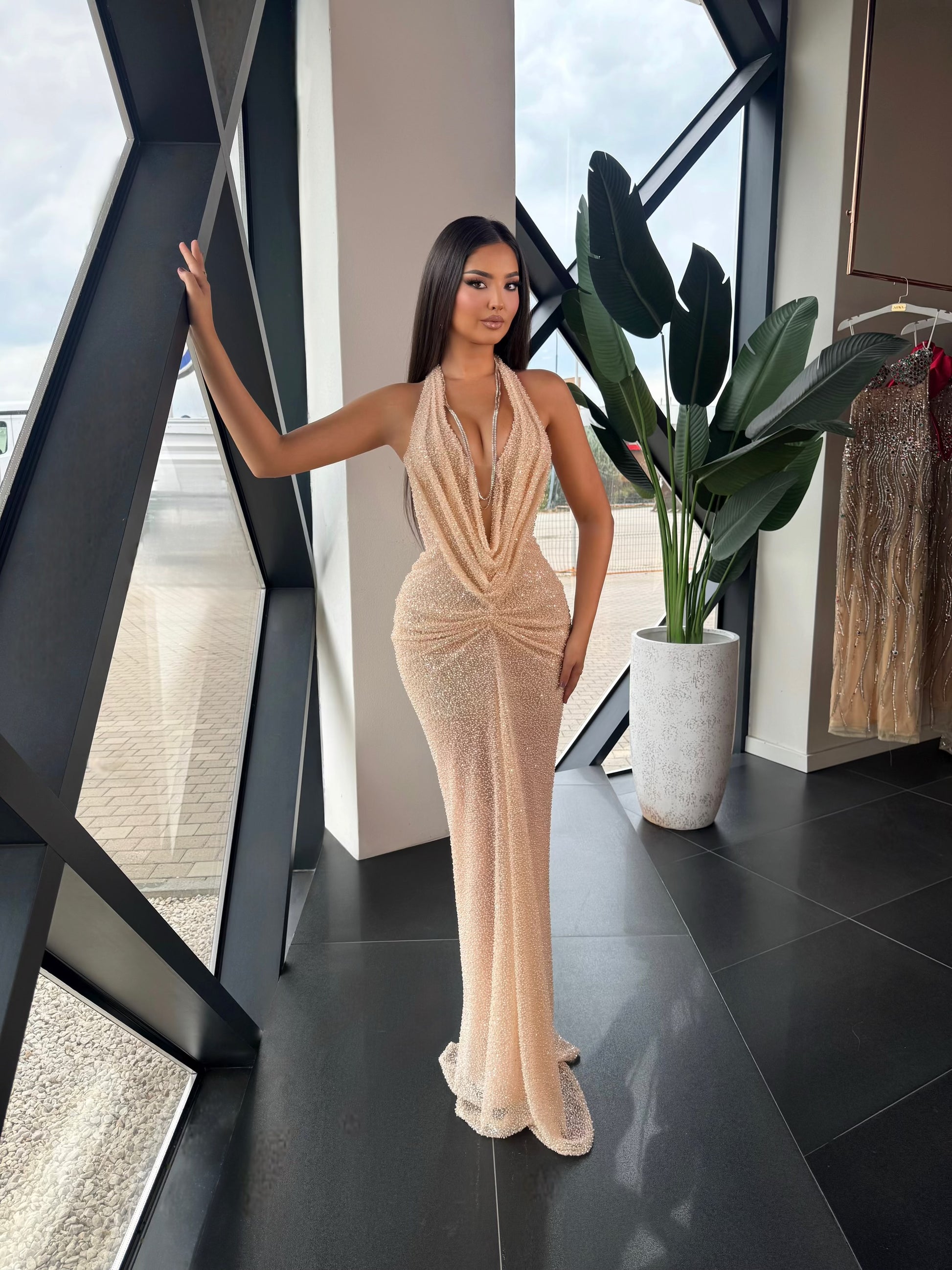 The gown features a sultry, draped cowl neckline with a deep plunge, subtly enhancing your silhouette while maintaining a refined, sophisticated look. Sleeveless and form-fitting, it hugs your curves in all the right places before flowing gracefully to the floor.