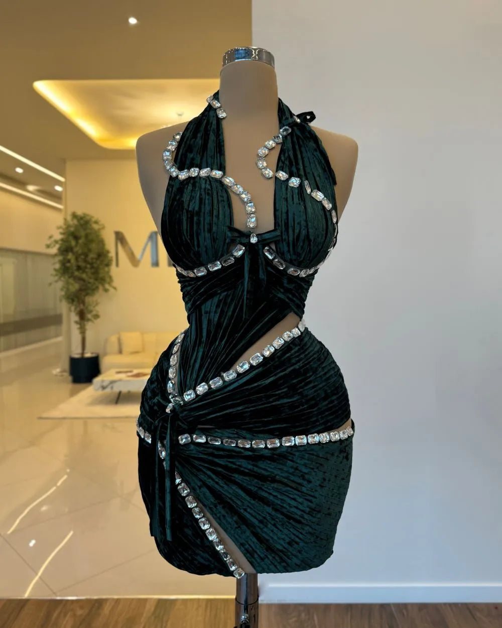 This mini dress is crafted from luxurious emerald green velvet, offering a rich and elegant texture with a subtle sheen. The design features a halter neckline with a fitted and sculpted bodice that enhances the natural curves. The skirt is draped with intricate folds, adding depth and movement
