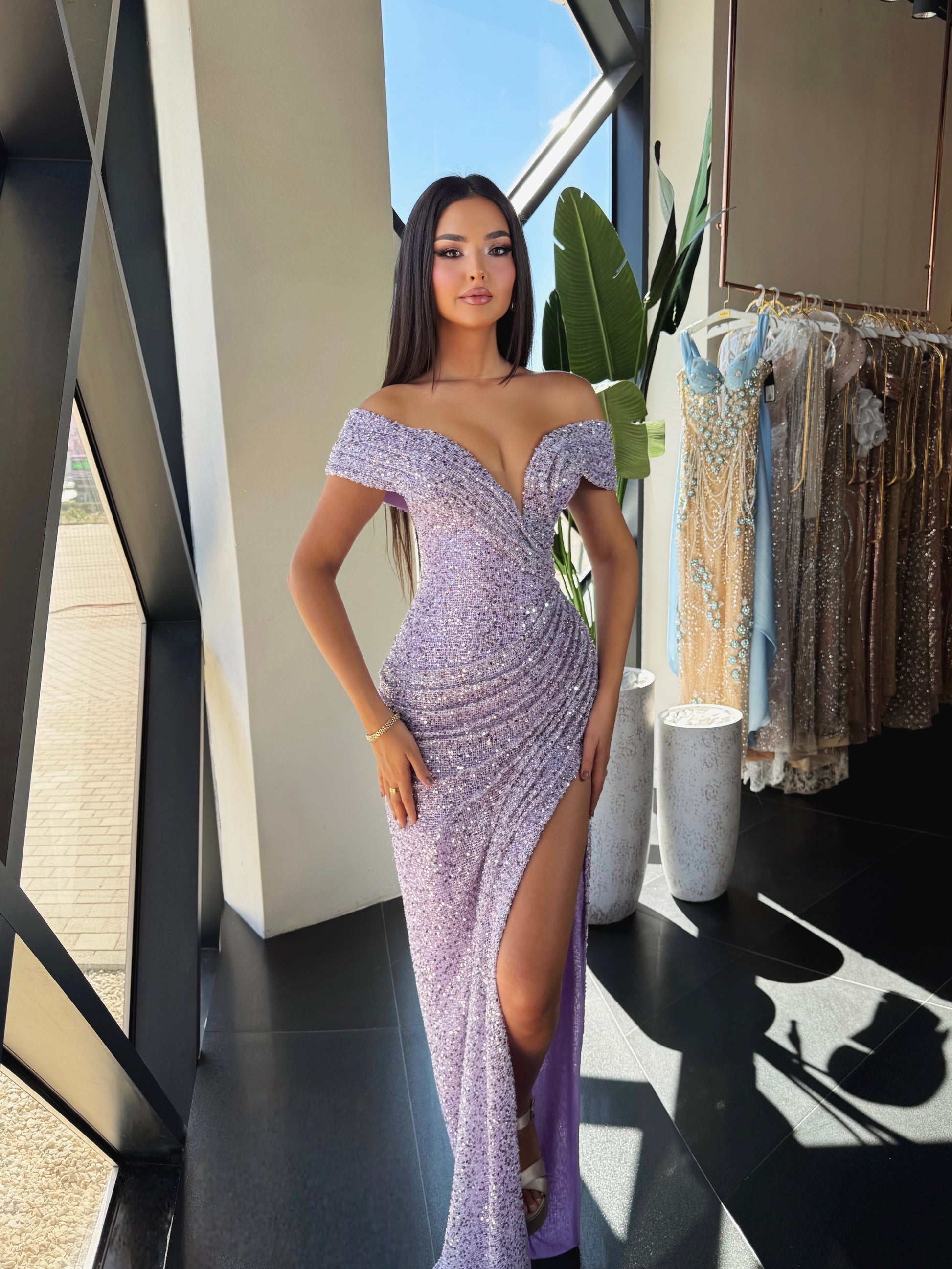 Glamorous off-shoulder evening gown, designed with a deep sweetheart neckline and elegant ruched detailing that flatters every curve. The shimmering fabric catches the light beautifully, while the thigh-high slit adds a bold and sophisticated touch. Perfect for special occasions, galas, and formal events.