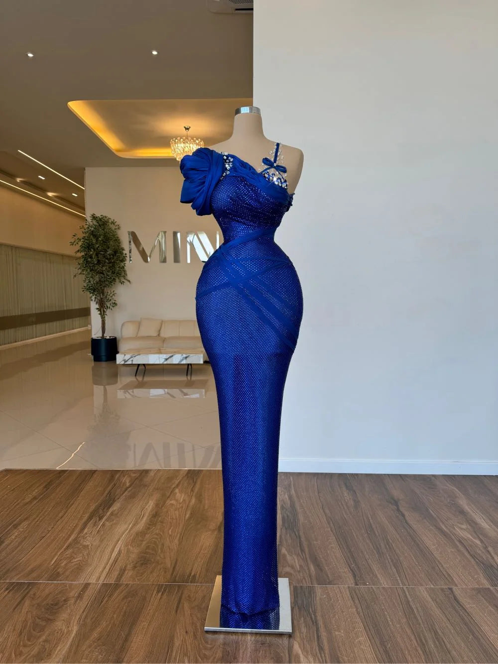 This royal blue long evening dress is a form-fitting piece that radiates luxury and elegance. It has a unique asymmetrical design with a structured, gathered shoulder detail on one side, balanced by a delicate strap and floral embellishments on the other, adding depth and interest. The fabric has a subtle, shimmering texture, beautifully contouring the body to enhance the figure. The wrap-style detailing around the waist creates a flattering, sculpted effect. This dress is ideal for a formal event, exuding sophistication with a touch of glamour, perfect for a confident, poised look.