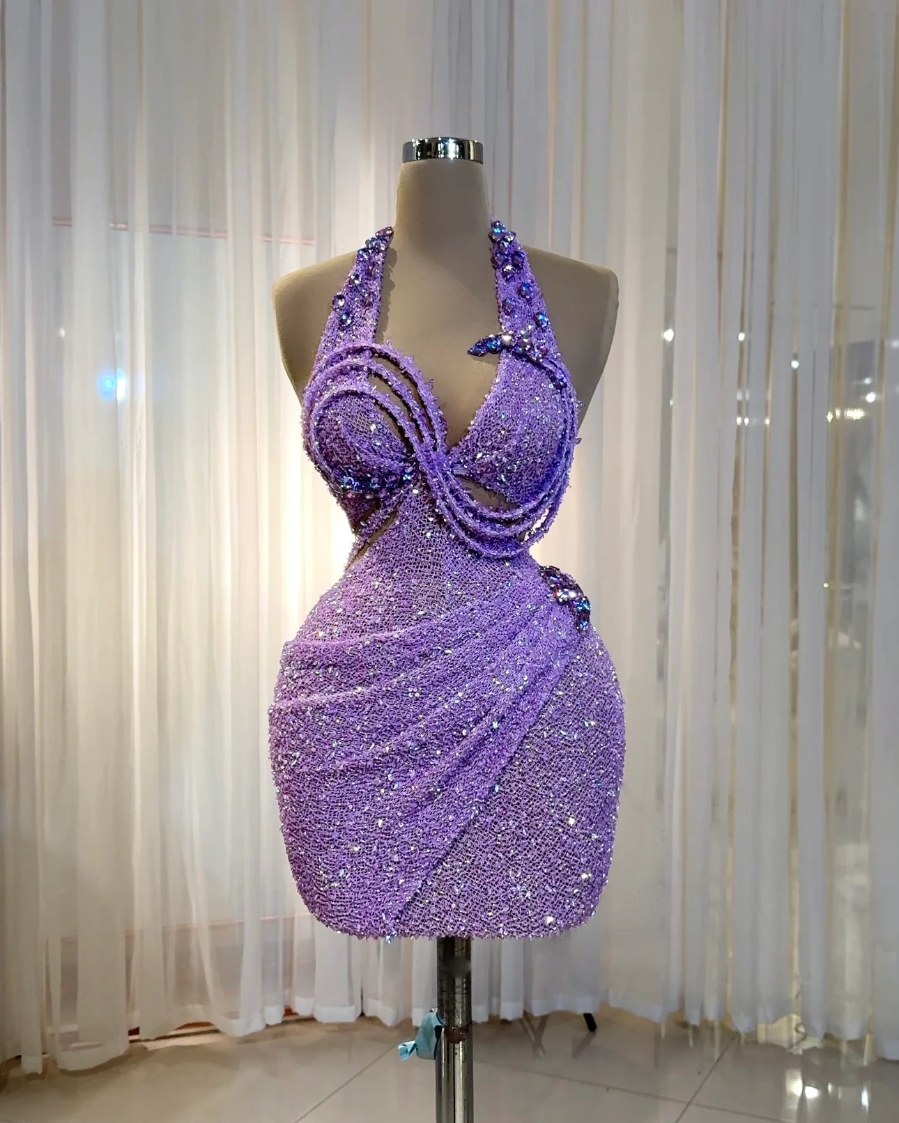 A vibrant lavender purple, adorned with shimmering sequins and crystal embellishments, creating a radiant sparkle that catches the light with every movement.