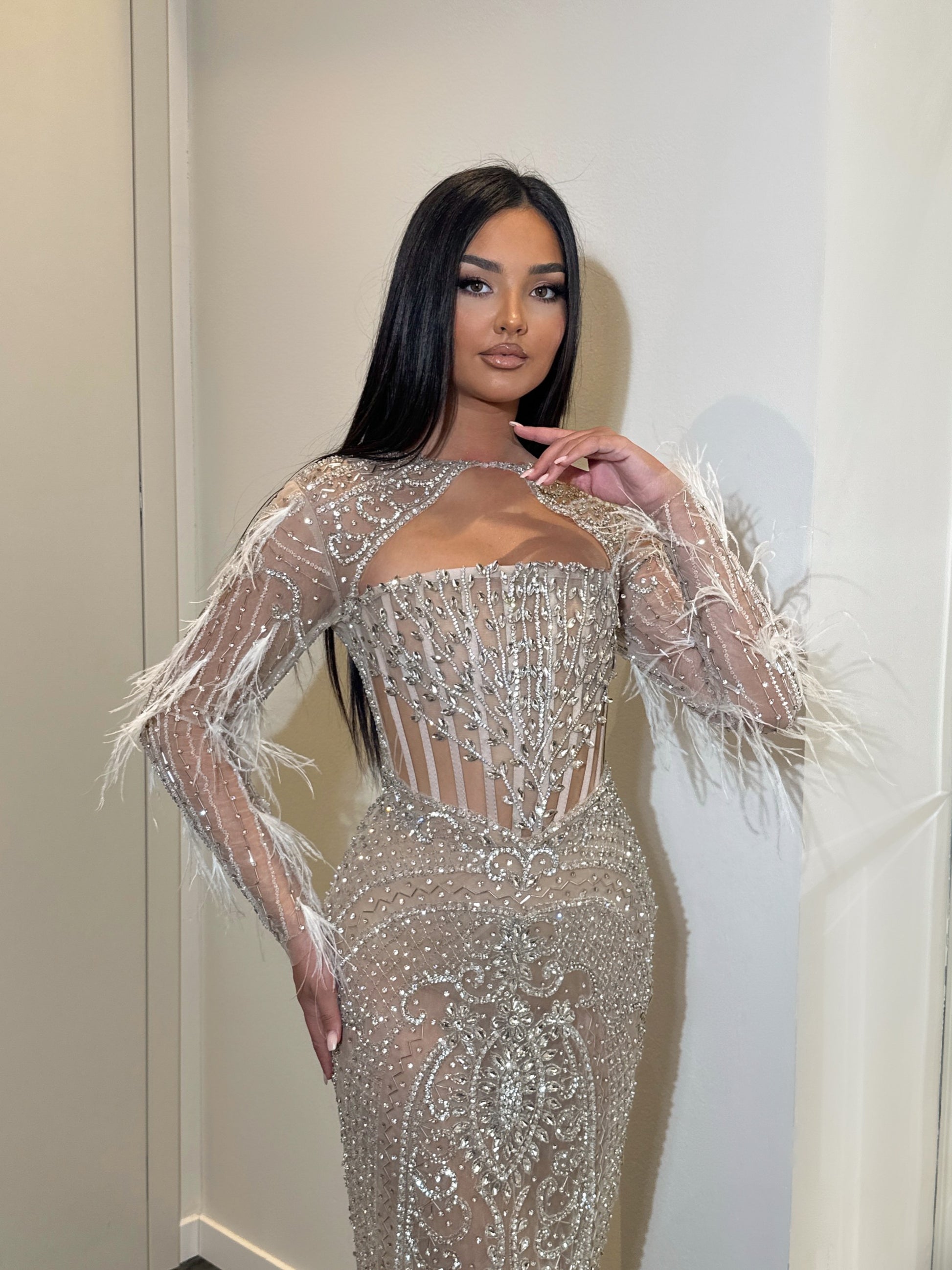 Have a look at our "Moesa" glamorous long elegant dress...Details like this are what make a dress a real "Haute Couture" one. From the very design, to the smallest details, this dress will leave you speechless. Two long sleeves are added for a classic look, while the top part with a visible corset boning make a little twist to the modern design. Feather details are carefully added too. The handmade details on the top part are shiny stones in leaf like shape.