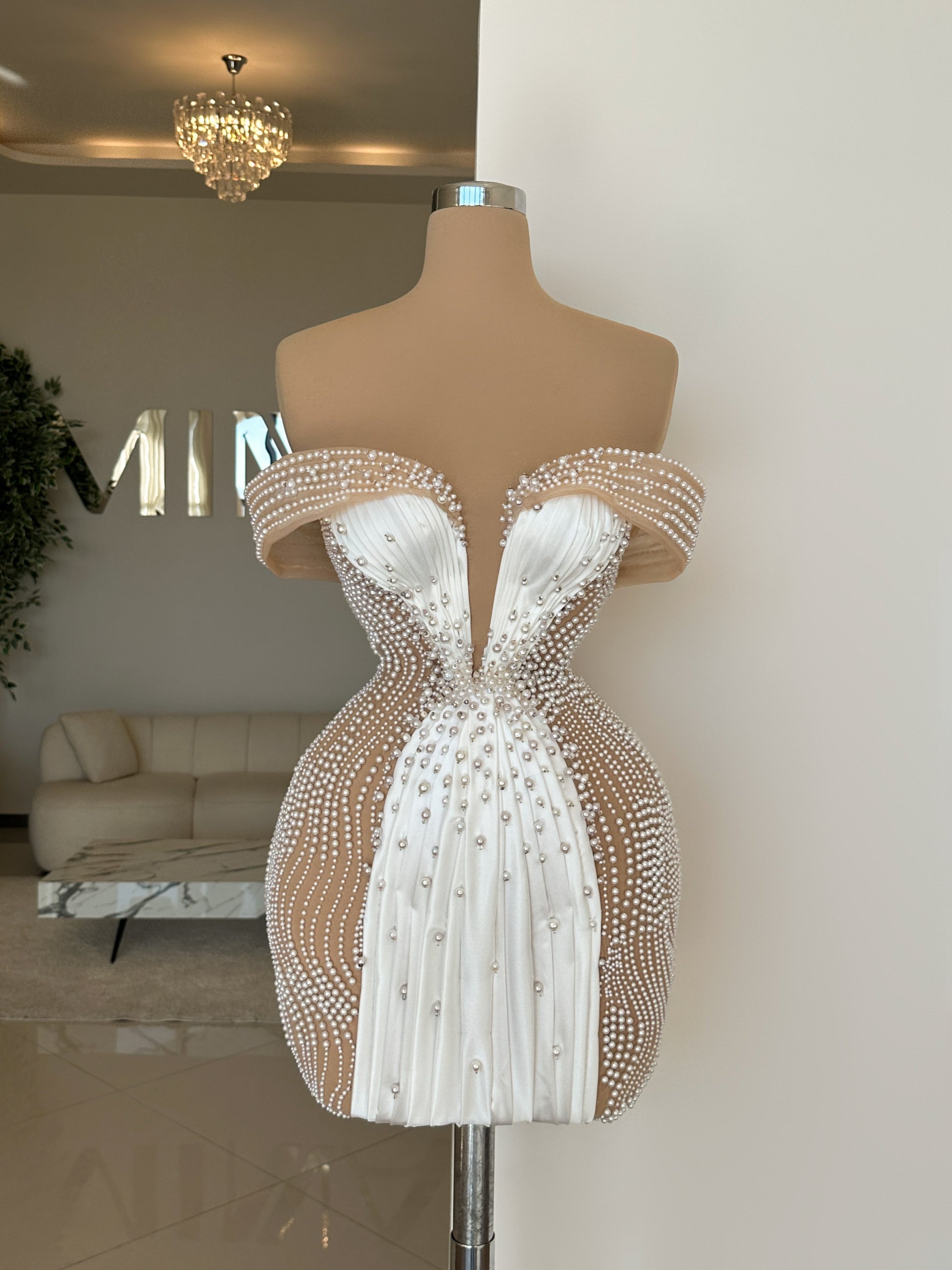 Our "Orvelle" mini cocktail and party dress is a dreamy combination of pearls and satin, the perfect blend for these two. The off shoulder design and the sweetheart neckline are what characterize the overall design. Handmade white pearls are uniquely added to make a difference to any other dress design.