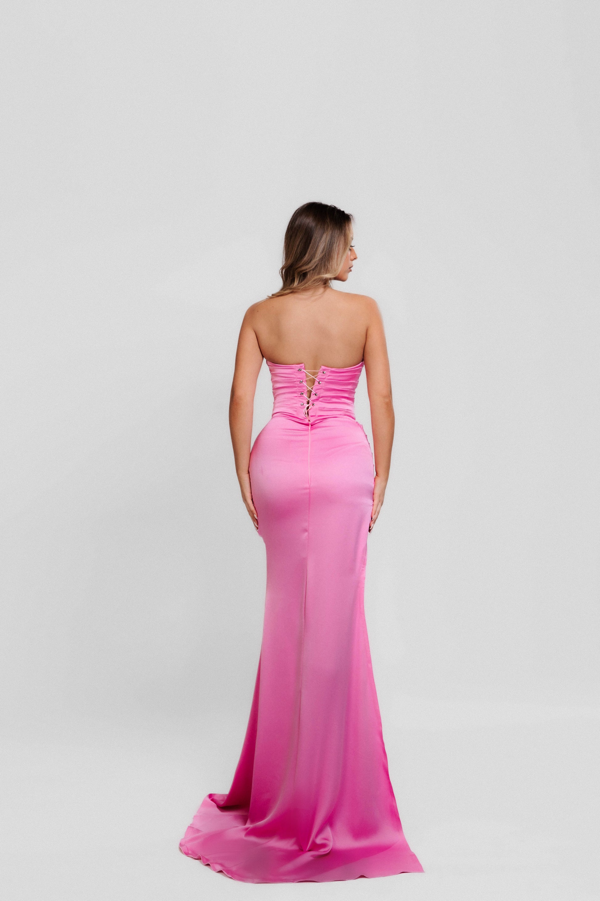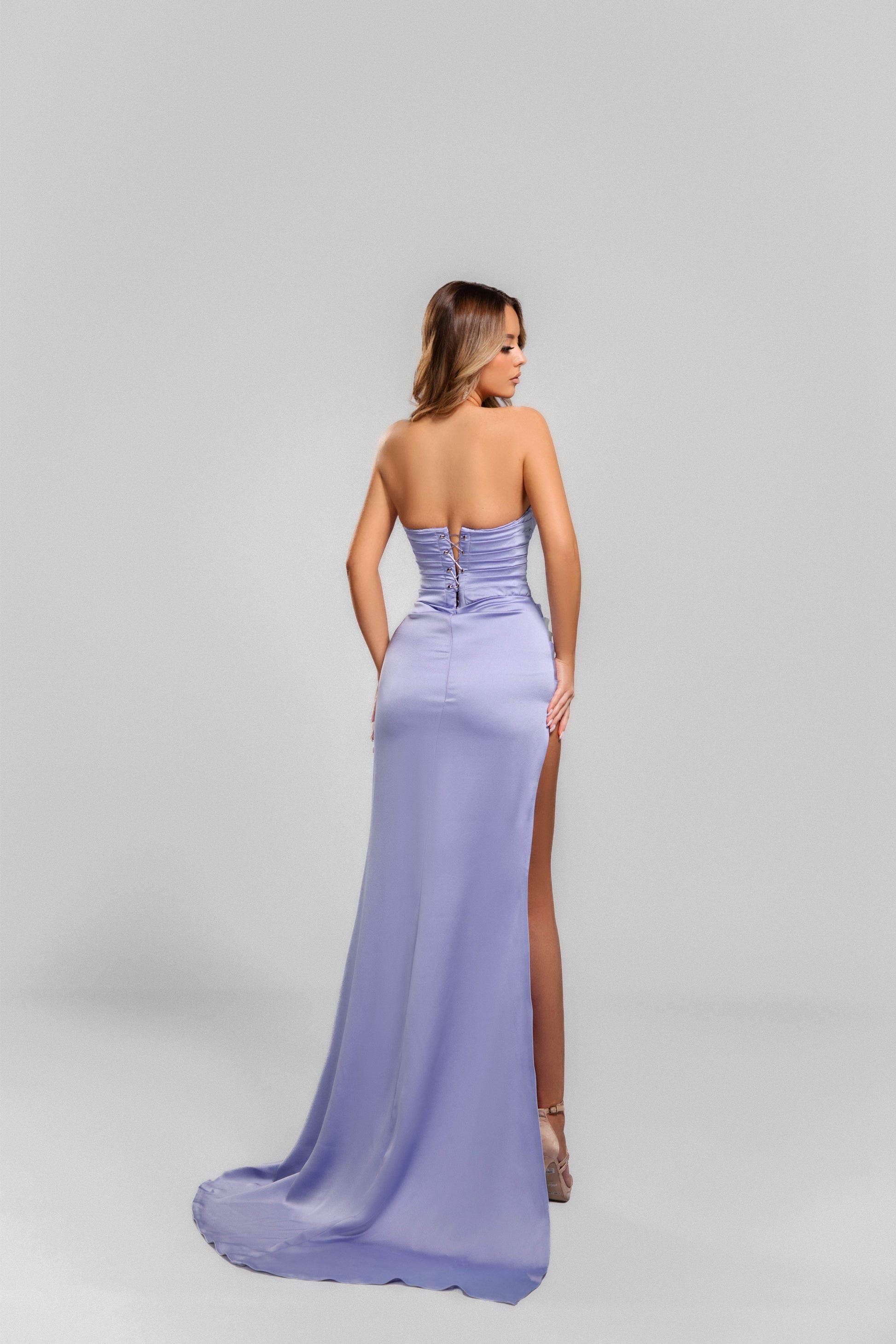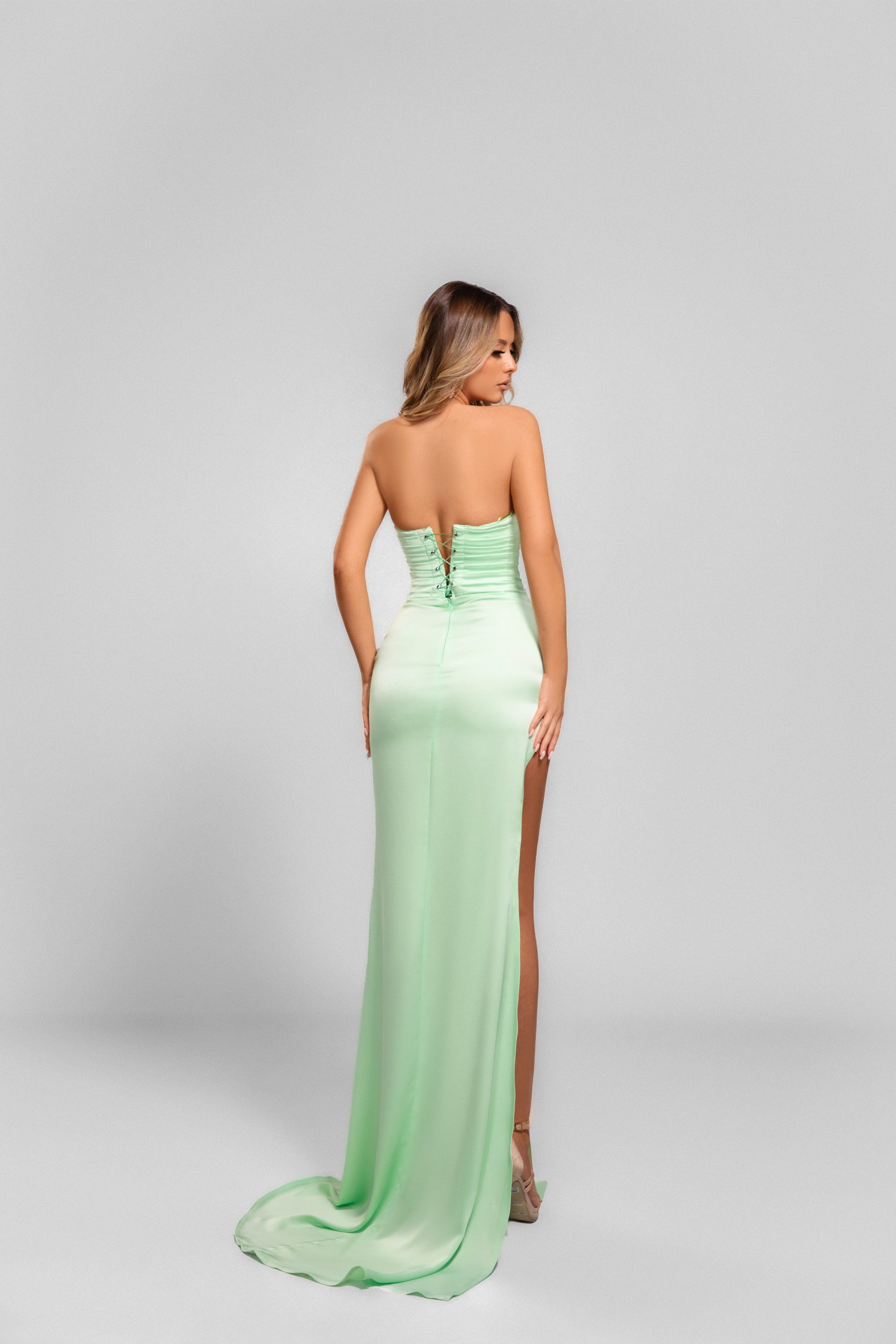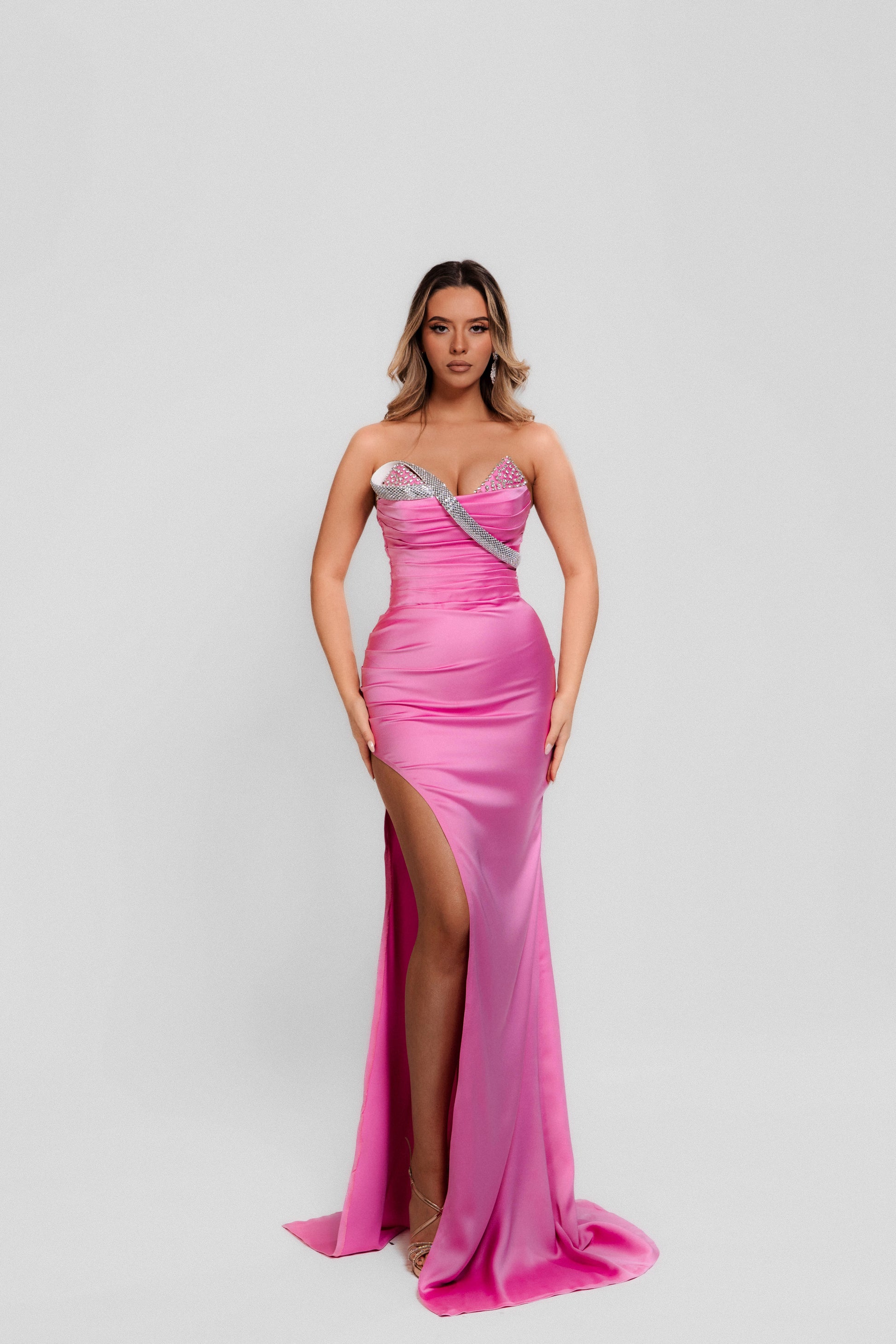 This dress presents a stunning display of luxury and glamour, perfect for any formal evening event. The fitted bodice, adorned with intricate beadwork, creates a striking contrast with the smooth, sleek lines of the skirt. A daring thigh-high slit adds a touch of allure and sophistication, while the overall silhouette with its mermaid tail and elegant train encapsulates both a sexy and classy aesthetic.