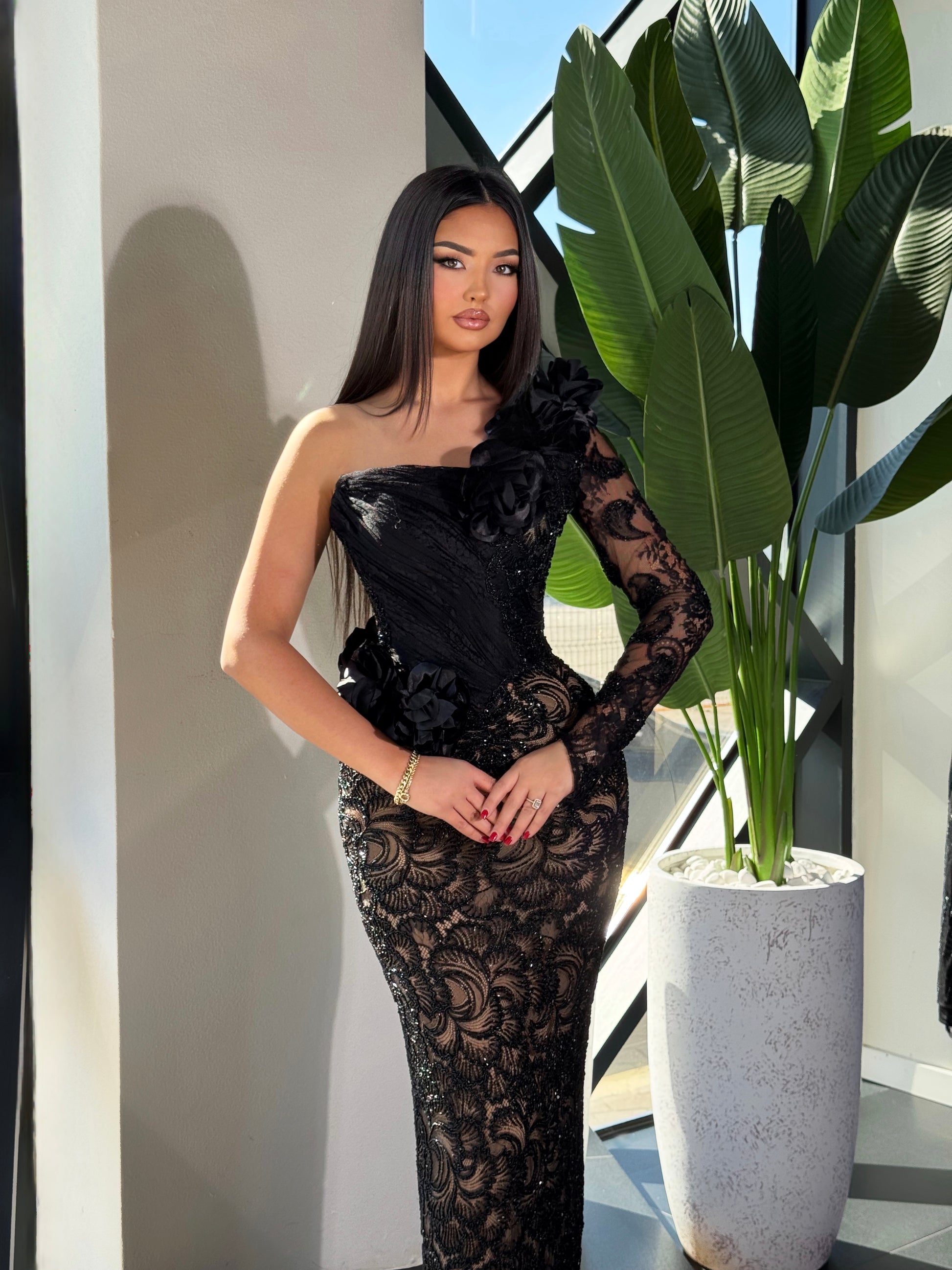 The gown is asymmetrical with one side featuring an off-the-shoulder neckline adorned with delicate black floral appliques creating a luxurious and dramatic effect.
