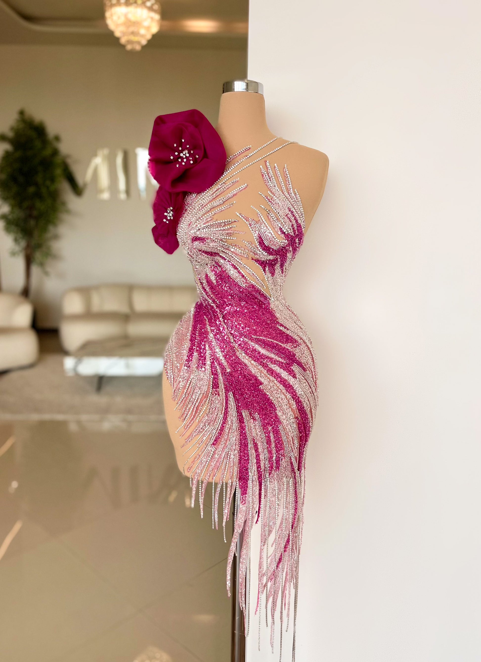 Wendy dress is a swirling color combination of pink and silver, with a rose ruffle detail on the shoulder part. Thin lines of silver fabric come to the bust area and also the bottom area of this mini party dress. Those lines, and also more silver fringes are handsewn on the other part of the dress, making an illusion as if the dress is long on one side. Those fringes will catch the attention while you do the cat walk, and will make you walk with the confidence you desire.