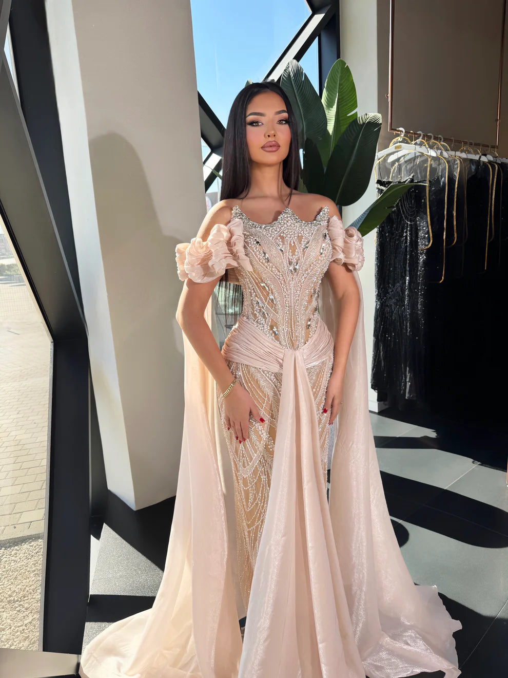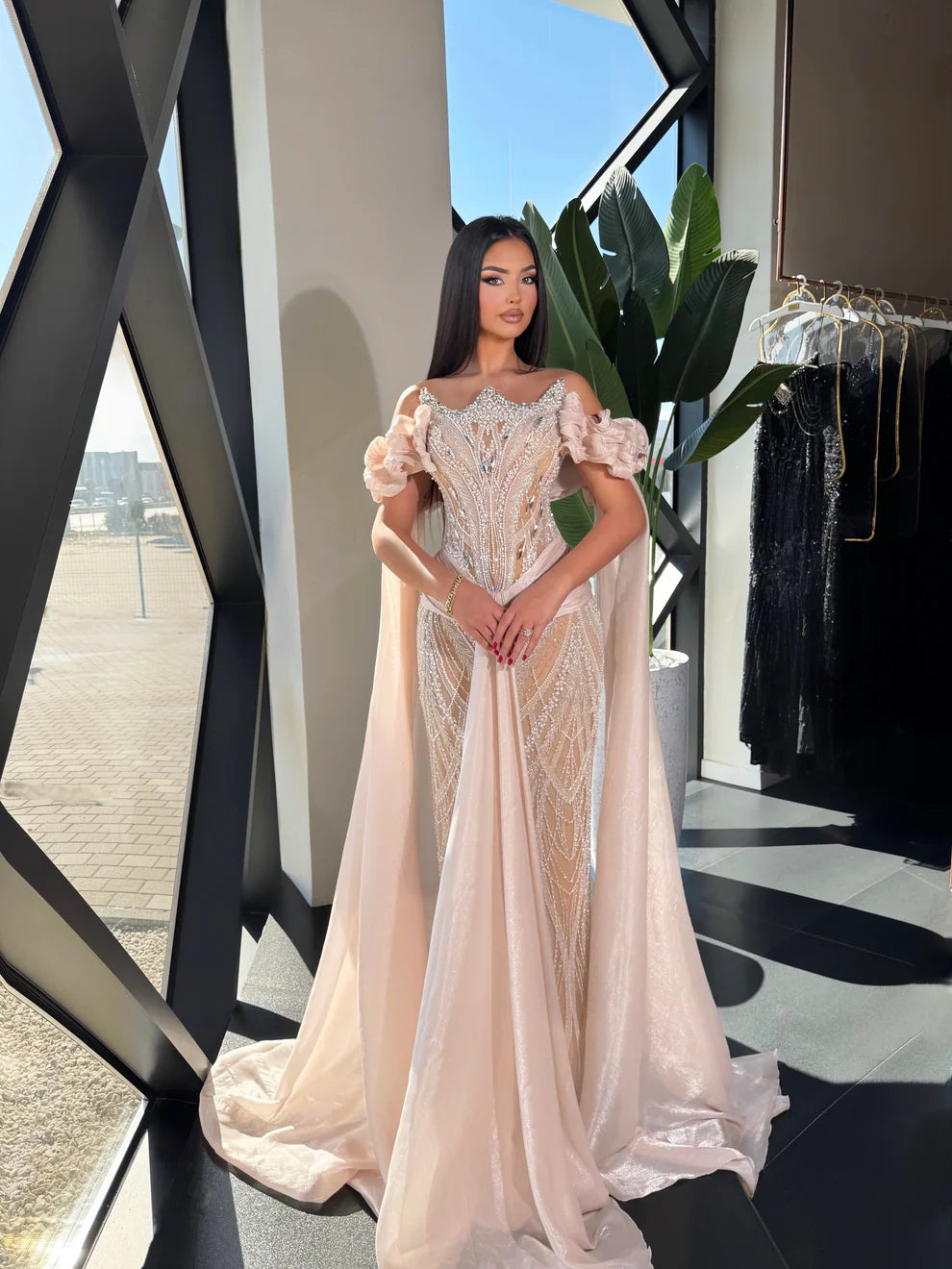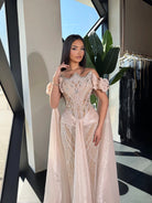 This couture gown is the epitome of high-fashion elegance, featuring a meticulously hand-beaded corset adorned with shimmering crystals in a striking sunburst motif. Perfectly balanced by romantic ruffled off-the-shoulder sleeves and a dramatic floor-sweeping cape, its sleek mermaid silhouette creates a breathtaking, red-carpet-ready look designed to captivate every eye in the room.