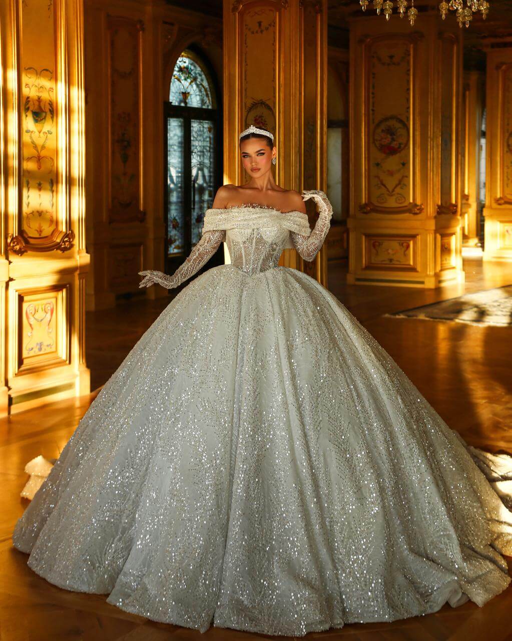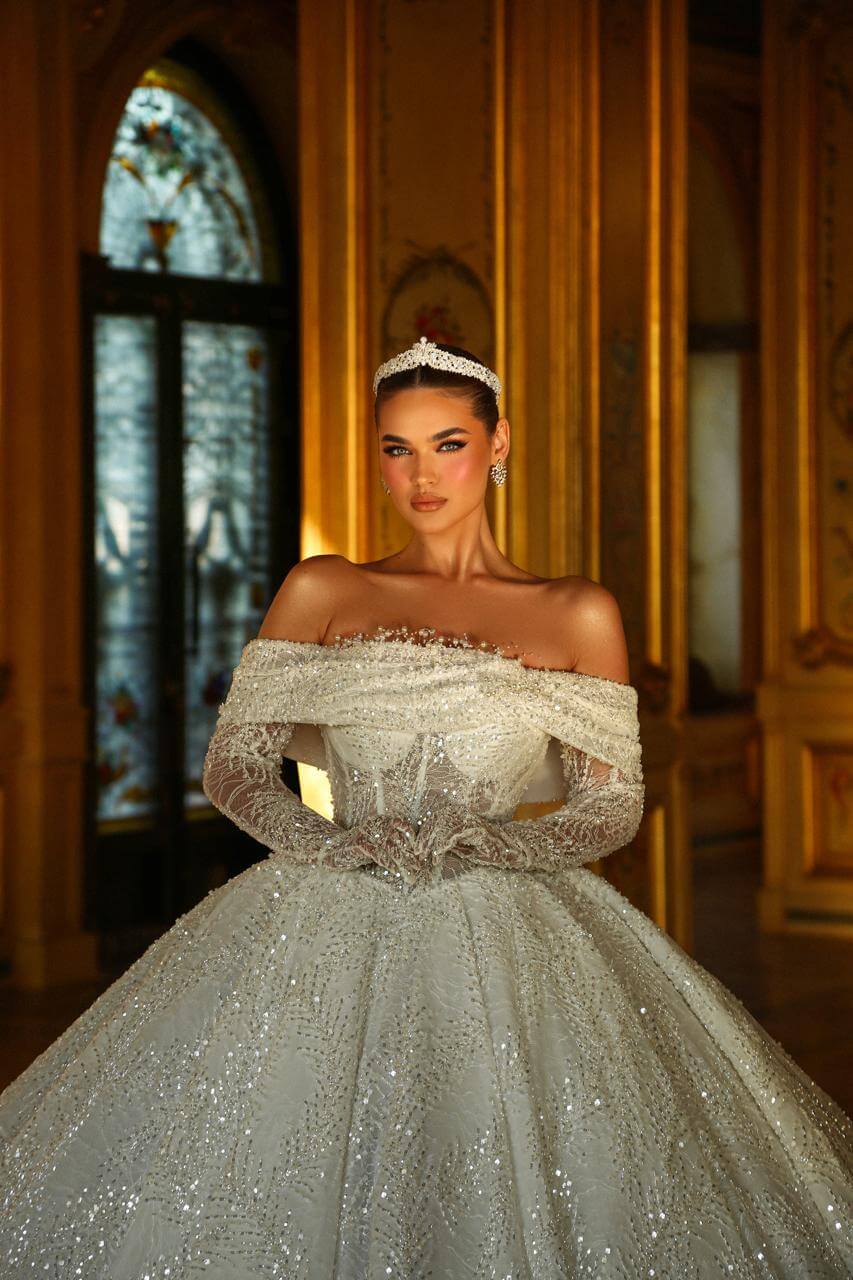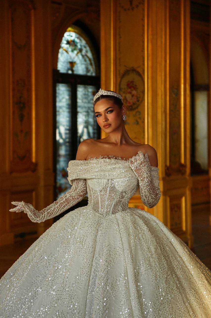 An exquisite masterpiece of bridal artistry. This gown features a corseted, off-the-shoulder bodice hand-beaded with pearls and crystals. Fine, sparkling lace covers the illusion gloves and voluminous skirt, creating a mesmerizing texture and ethereal sparkle with every movement. A true testament to detailed craftsmanship.