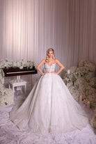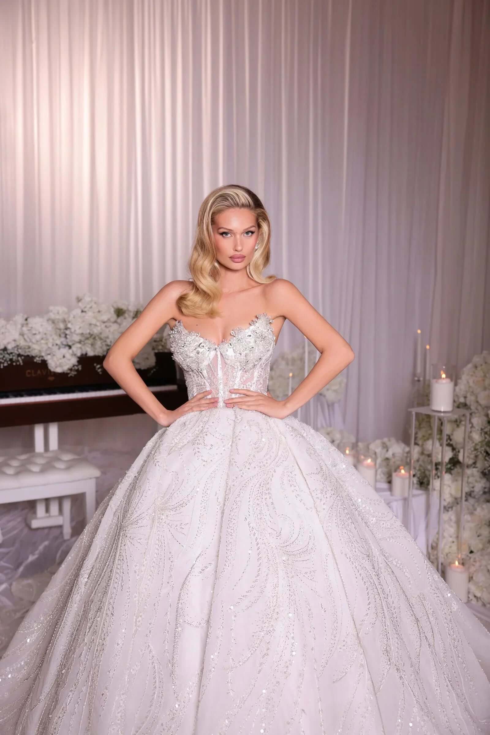 Featuring a sheer structured corset bodice adorned with 3D floral appliqué, pearls, and crystals, this gown merges delicate femininity with dramatic elegance. The voluminous ball gown skirt is fully embellished with swirling sequin embroidery that sparkles from every angle.