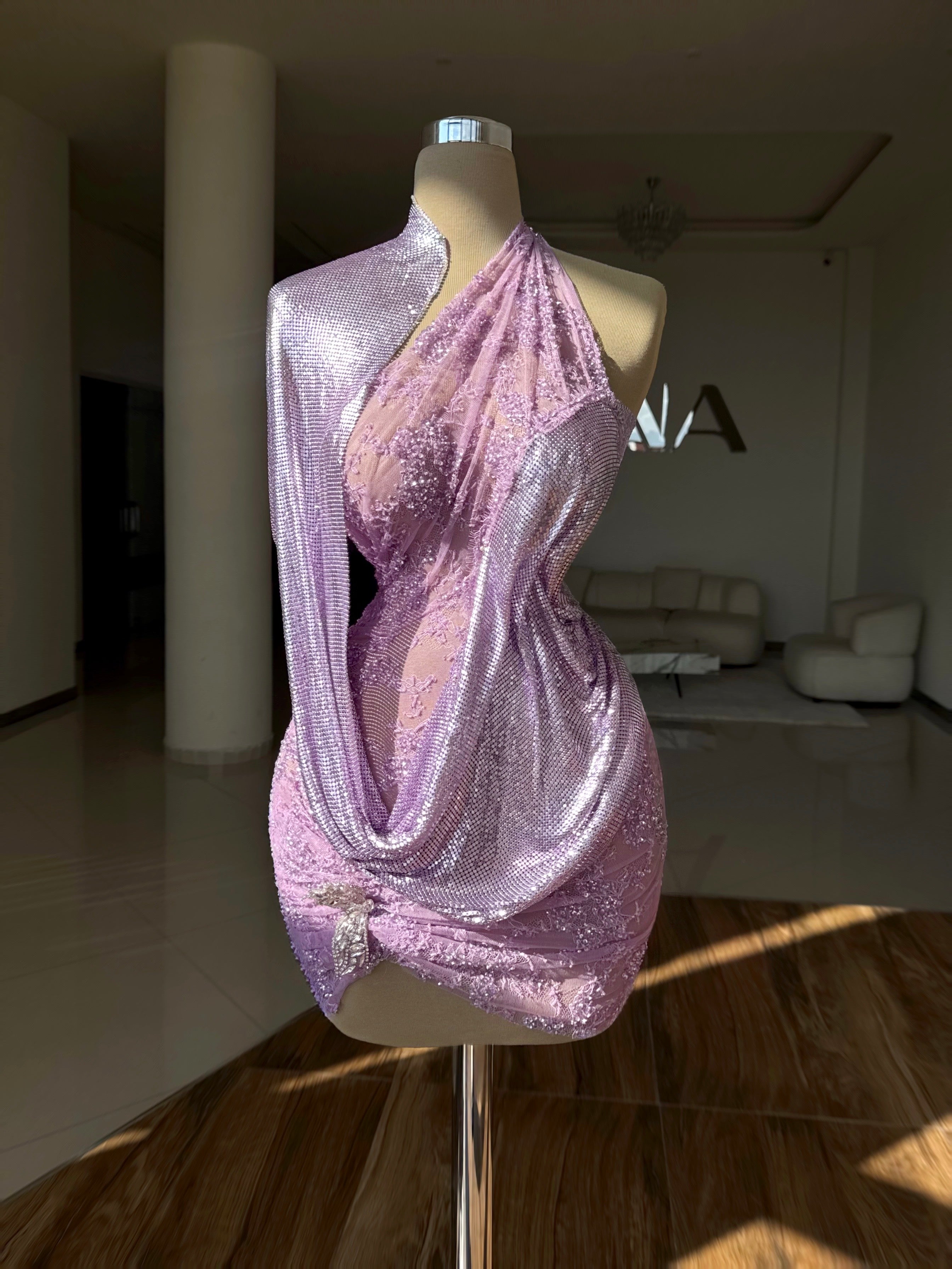 A soft lilac dress in a light but perfectly balanced shade that feels elegant and refined. Covered in delicate sequins, it reflects the light beautifully and creates a subtle, luminous glow. Perfect for special evenings when you want to shine in a natural and effortless way. ✨