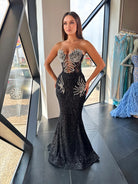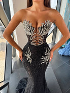 Our "Mayra" dress is a stunning, floor-length dress, designed with stones and sparkling embellishments. The strapless, sweetheart neckline is adorned with shimmering crystals that go down, creating a glamorous and elegant look. The dress flares out slightly at the bottom into a dramatic mermaid tail, accentuated with delicate, flowing fabric that adds a touch of elegance and sophistication. The nude color of this long evening dress enhances its luxurious feel, making it a perfect choice for a red carpet or formal event.