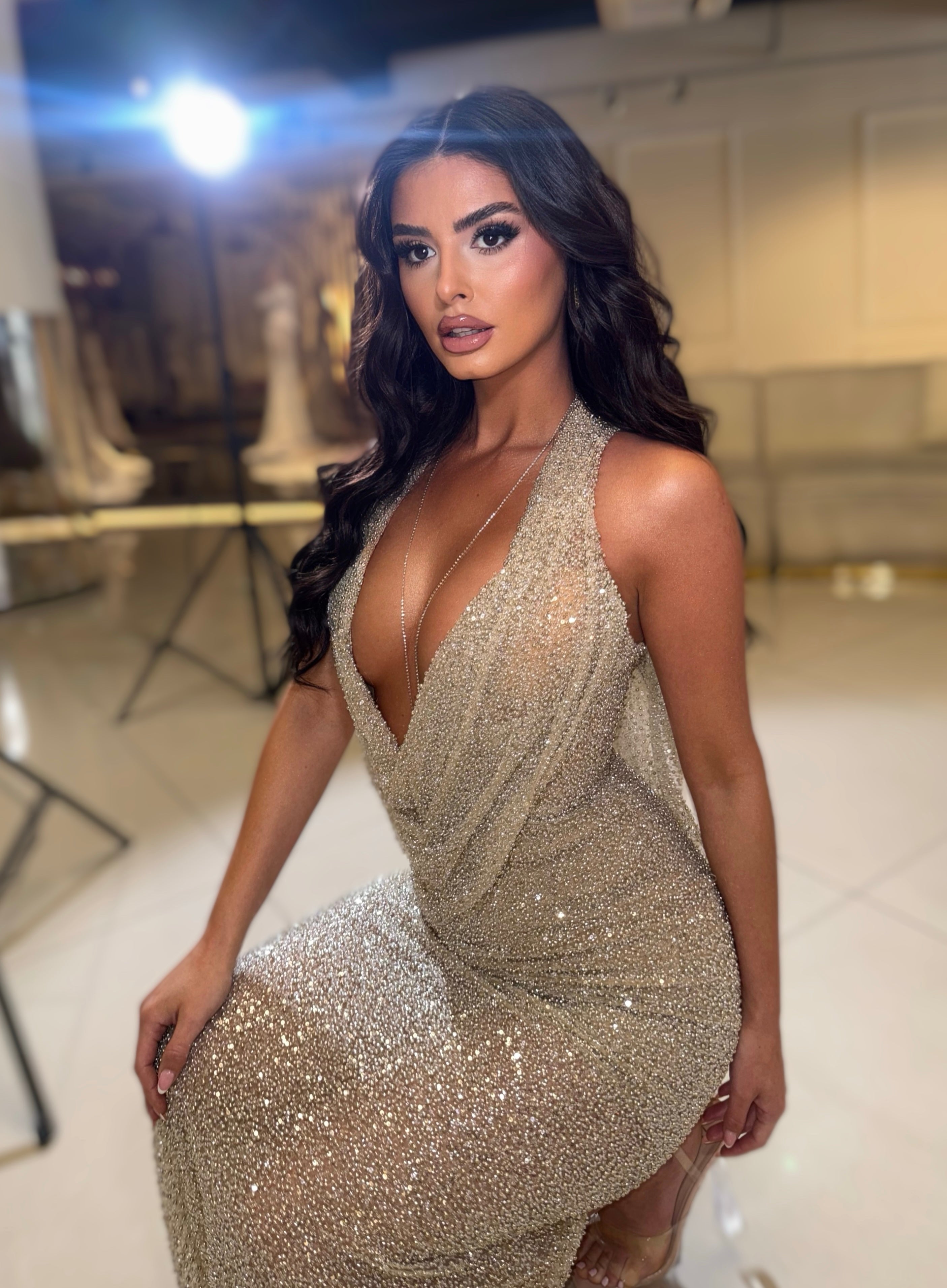 A nude dress designed with shimmering beads that create a refined and elegant look. The delicate shine across the fabric adds depth and subtle glamour, while the soft nude tone keeps the design timeless and sophisticated.