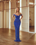A stunning off-shoulder design in radiant sapphire blue. This floor-length silhouette features a draped cowl neckline, glitter fabric that catches every light, and delicate embellished straps for an extra touch of glamour.