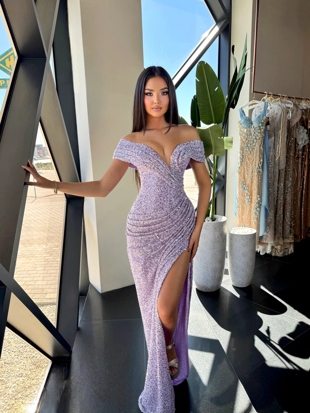 Glamorous off-shoulder evening gown, designed with a deep sweetheart neckline and elegant ruched detailing that flatters every curve. The shimmering fabric catches the light beautifully, while the thigh-high slit adds a bold and sophisticated touch. Perfect for special occasions, galas, and formal events.