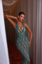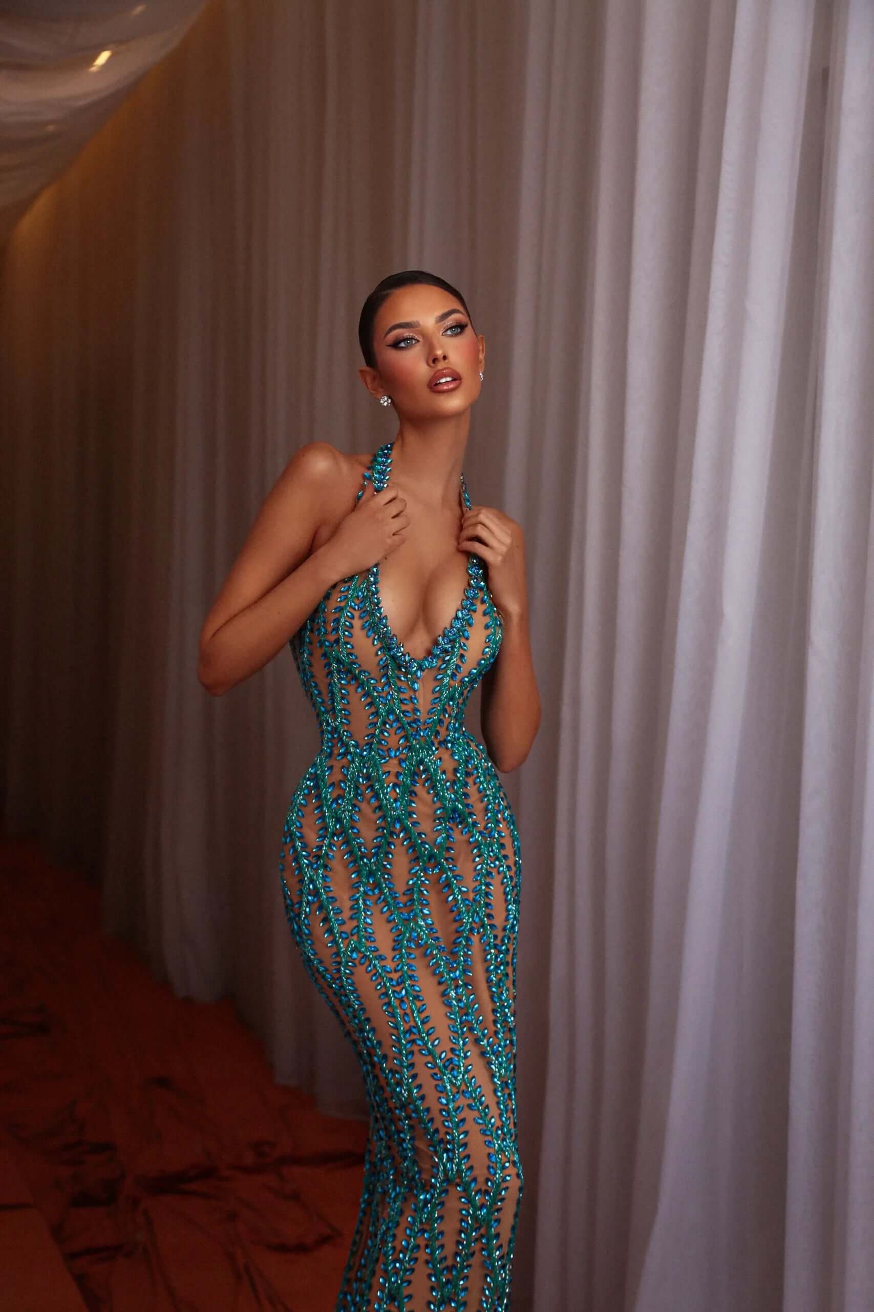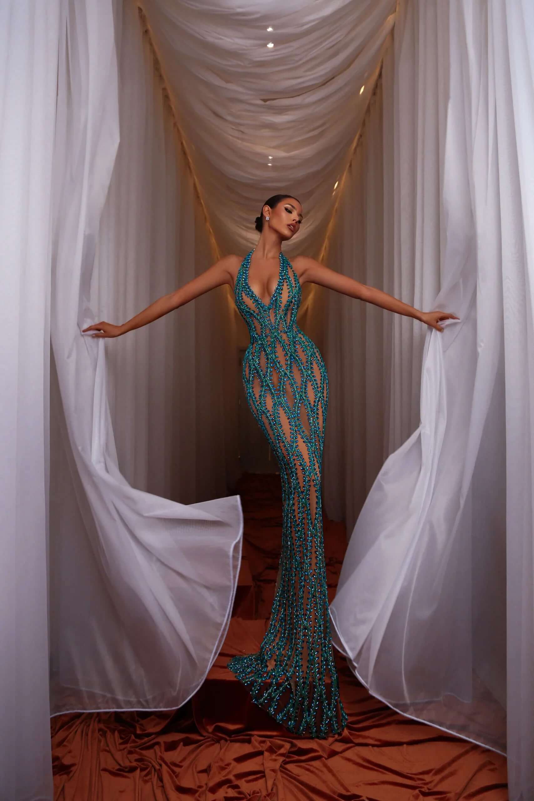 A vibrant turquoise gown encrusted with glittering embellishments that mimic cascading vines.