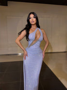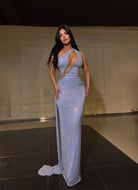 A long, elegant evening dress with a shimmering fabric and a body-hugging cut that accentuates the silhouette. The asymmetrical design with decorative details on the upper part gives it a modern and luxurious look, making it suitable for formal events.