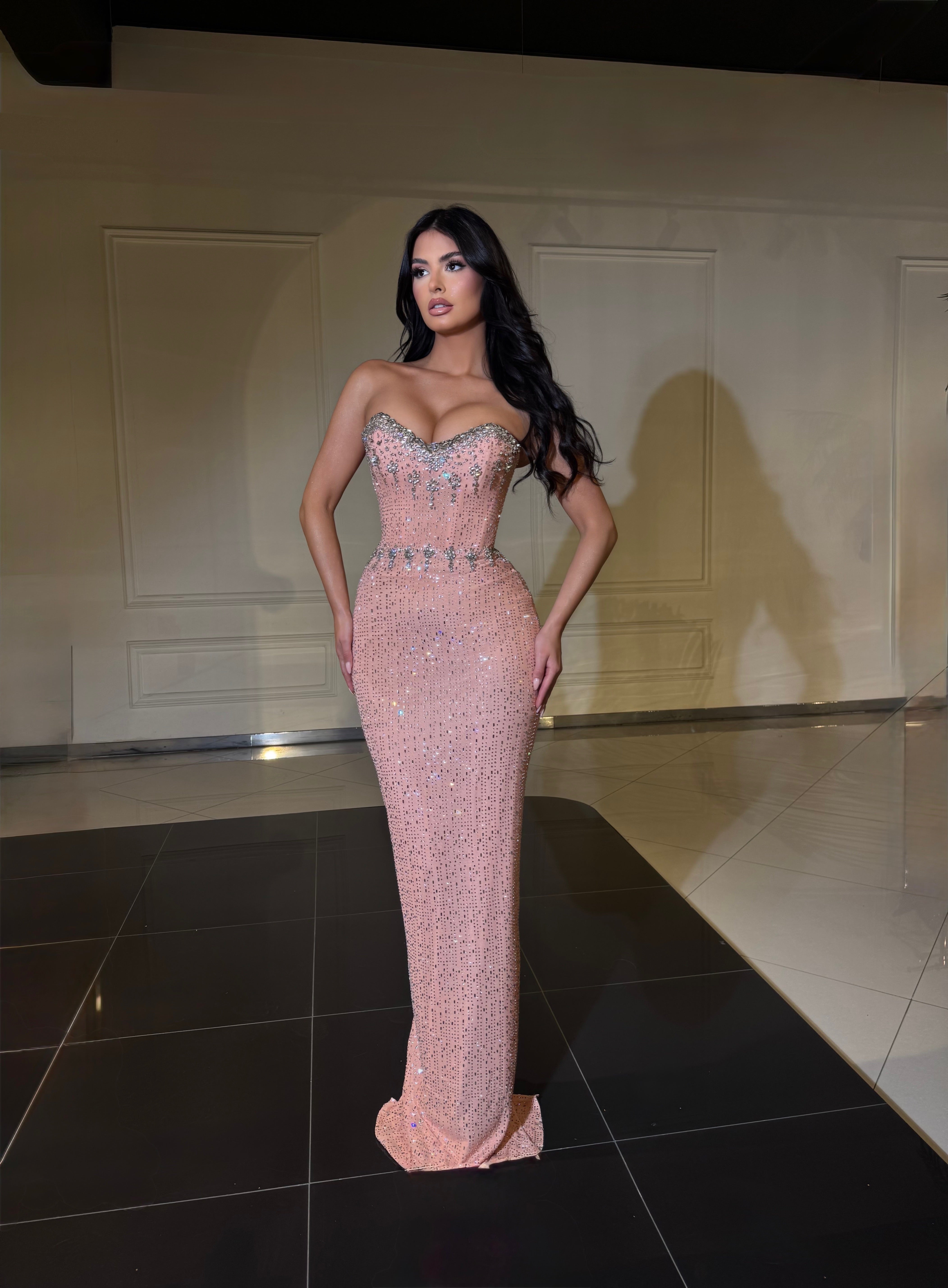 This is an elegant and highly sophisticated dress, designed for special occasions or formal evening events. It features a strapless neckline that highlights the shoulders and décolletage