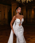 This spectacular piece features delicate straps and a sculpted sweetheart neckline, with the entire bodice and floor-length skirt covered in cascading strands and beads that create a captivating, draped effect over the fitted base.