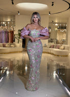 This Freida dress features an off shoulder design with a chic floral print, perfect for a stylish and elegant look. The dress is made with a long hemline that adds a touch of sophistication. Showcase your fashion sense with this stunning piece.