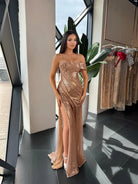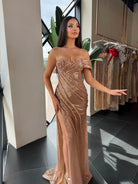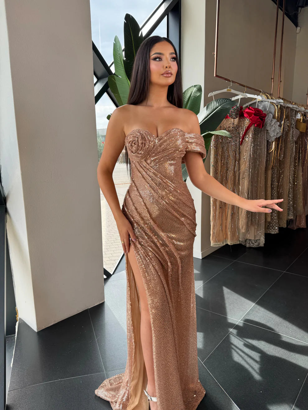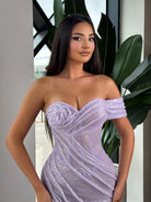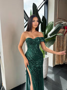 Dazzling off-shoulder gown, featuring a form-fitting silhouette, sweetheart neckline, and a high thigh slit for a bold yet elegant look. Covered in shimmering sequins, this dress is perfect for prom, formal events, or any special occasion.
