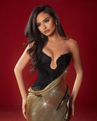 This magnificent gown commands attention with its dramatic contrast and luxurious texture. It features a structured, strapless black corset bodice with a daring plunge neckline that sculpts the figure. The black bodice is sharply contrasted by the floor-length skirt, which is crafted from a fluid, shimmering liquid gold sequin mesh. The skirt is draped and ruched across the hips and features delicate black lace trimming along the edges, seamlessly blending sophisticated structure with high-wattage glamour.