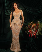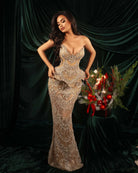 This gold sequined evening gown dress, features an intricate, hand-embellished crystalline bodice and a structured peplum waistline. The shimmering gold metallic embroidery cascades down to a floor-length finish, blending timeless glamour with a modern, high-fashion edge—ideal for red carpets, galas, or any elite celebration.