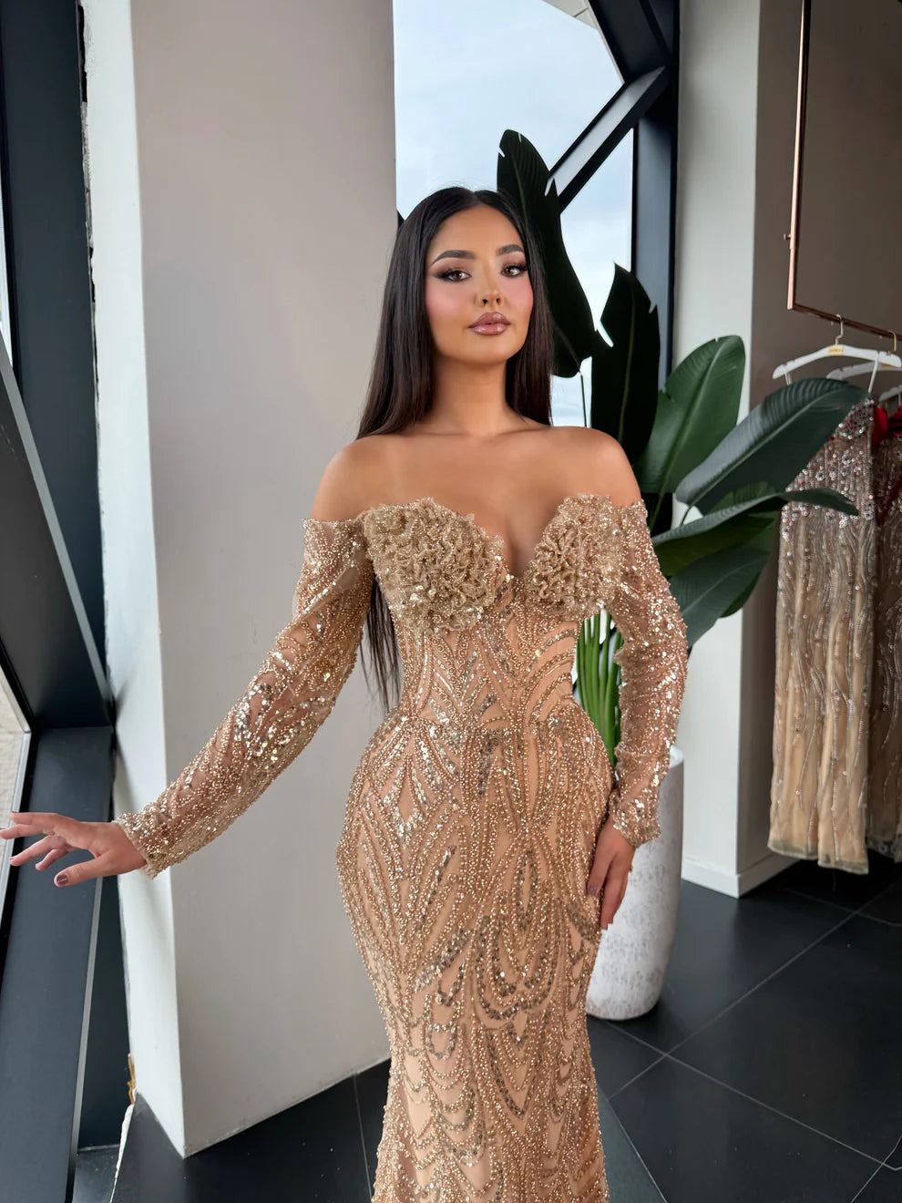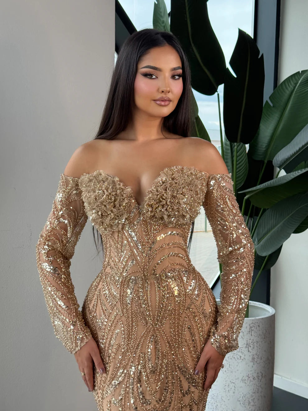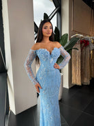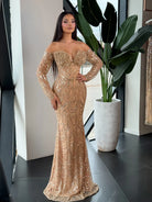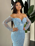 Gracefully captivating, this floor-length gown exudes timeless glamour. Designed with a sophisticated off-shoulder neckline, it reveals the collarbones and shoulders with effortless elegance. The silhouette flows into a sleek, body-skimming fit, made from a shimmering, high-sheen fabric that catches the light with every step.