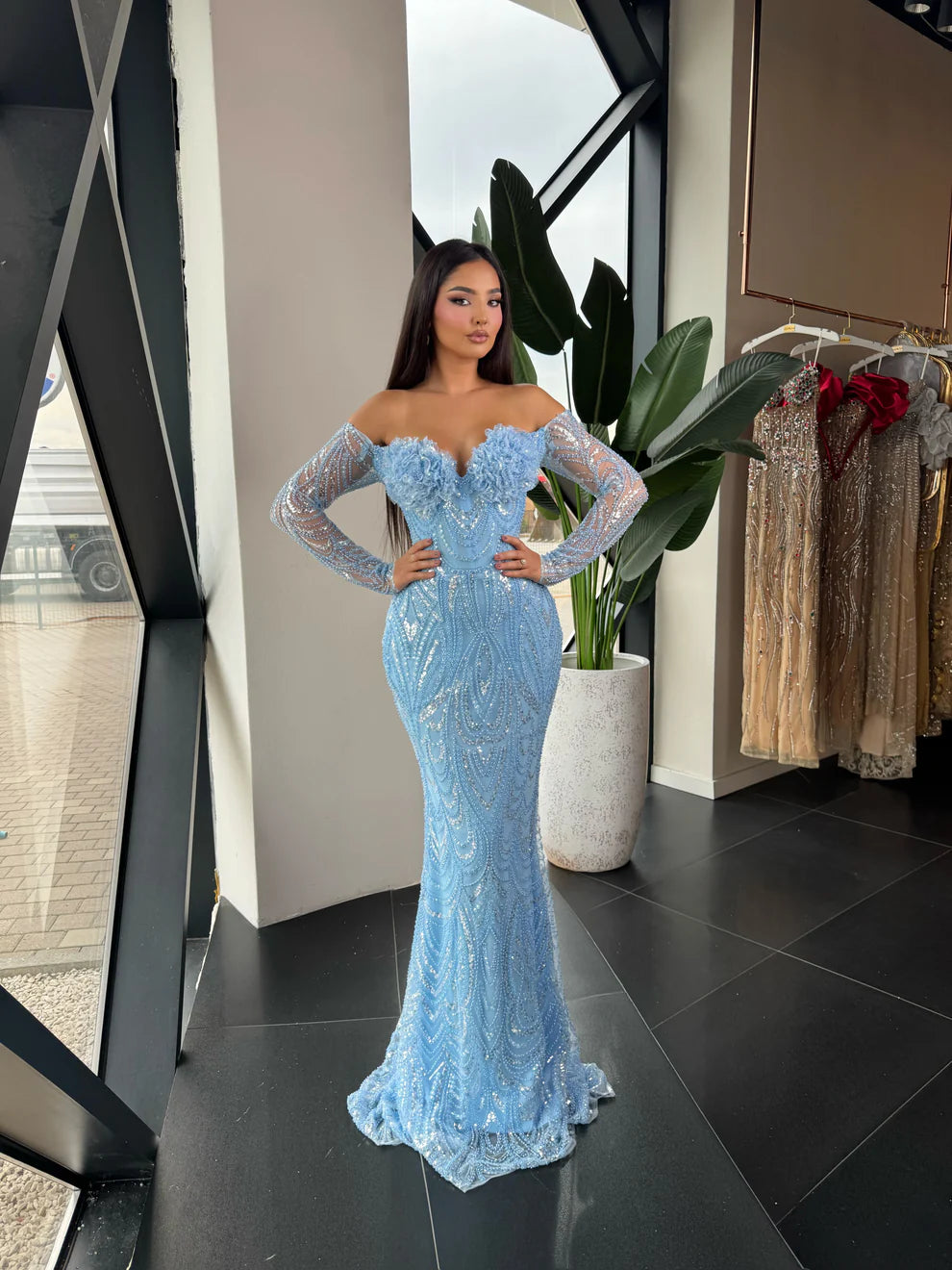 A delicate floral embellishment adorns the chest, adding a touch of romantic charm and refined femininity to the design. Whether worn at an evening gala, a red carpet event, or a special celebration, this dress is a true statement piece — crafted for those who command attention without saying a word.