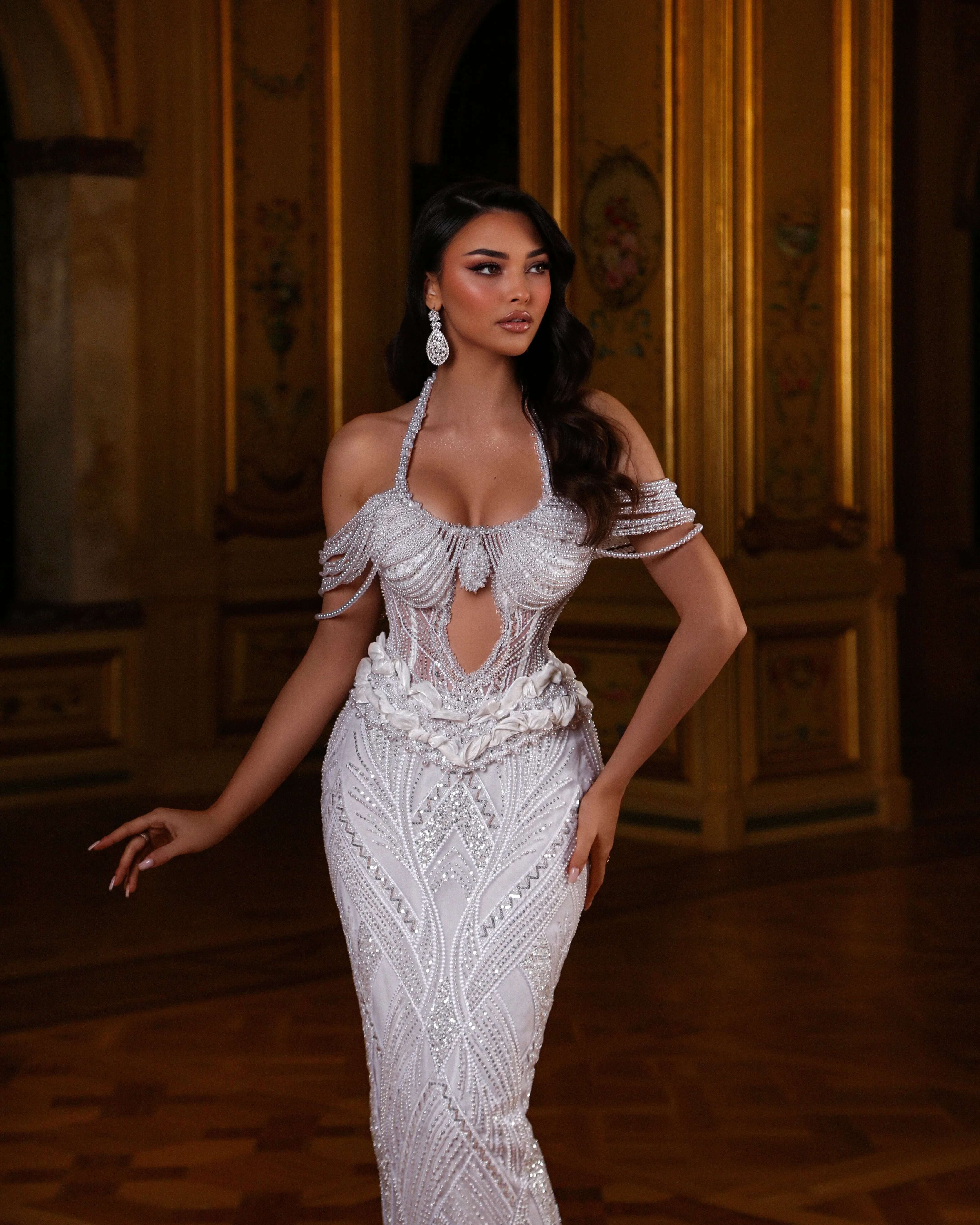 Paloma embodies sensual elegance and sculpted romance. Draped pearl-like strands frame the shoulders and décolletage, while intricate beadwork traces the silhouette with couture precision—designed for a bride who commands the room with quiet confidence and timeless allure.