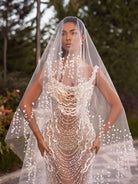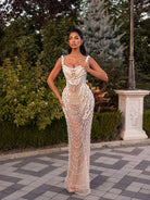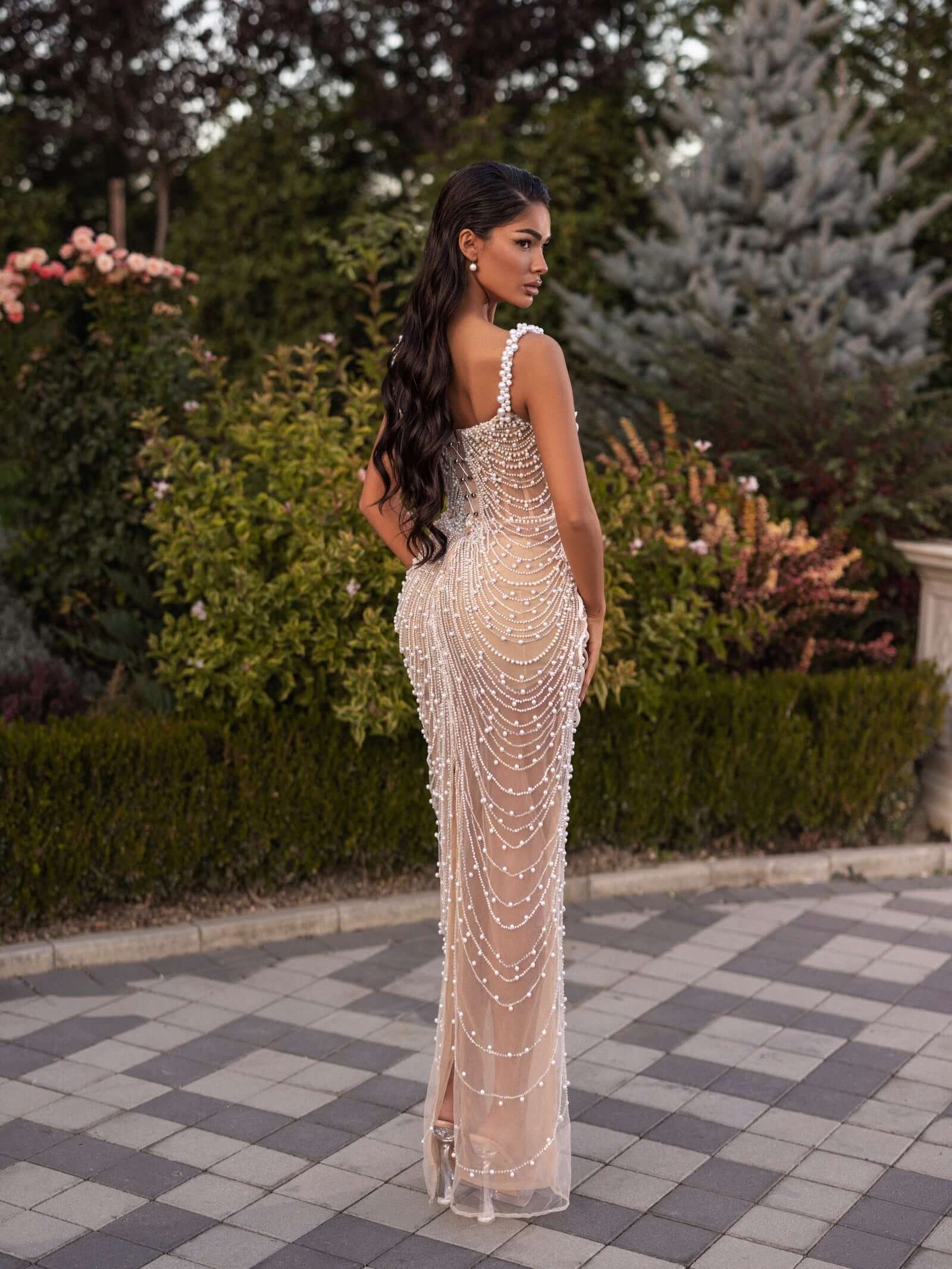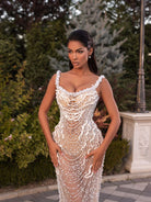 An incredibly luxurious column dress where texture and shimmer meet daring design. This spectacular piece features delicate straps and a sculpted sweetheart neckline, with the entire bodice and floor-length skirt covered in cascading strands of brilliant pearls and beads that create a captivating, draped effect over the fitted sheer-illusion base.