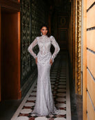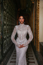 Pure is an embodiment of timeless elegance, defined by a high neckline, sculpted silhouette, and intricate lace embroidery that flows seamlessly across the gown. Delicate shimmer and refined craftsmanship create a look of quiet luxury—graceful, powerful, and impeccably bridal.